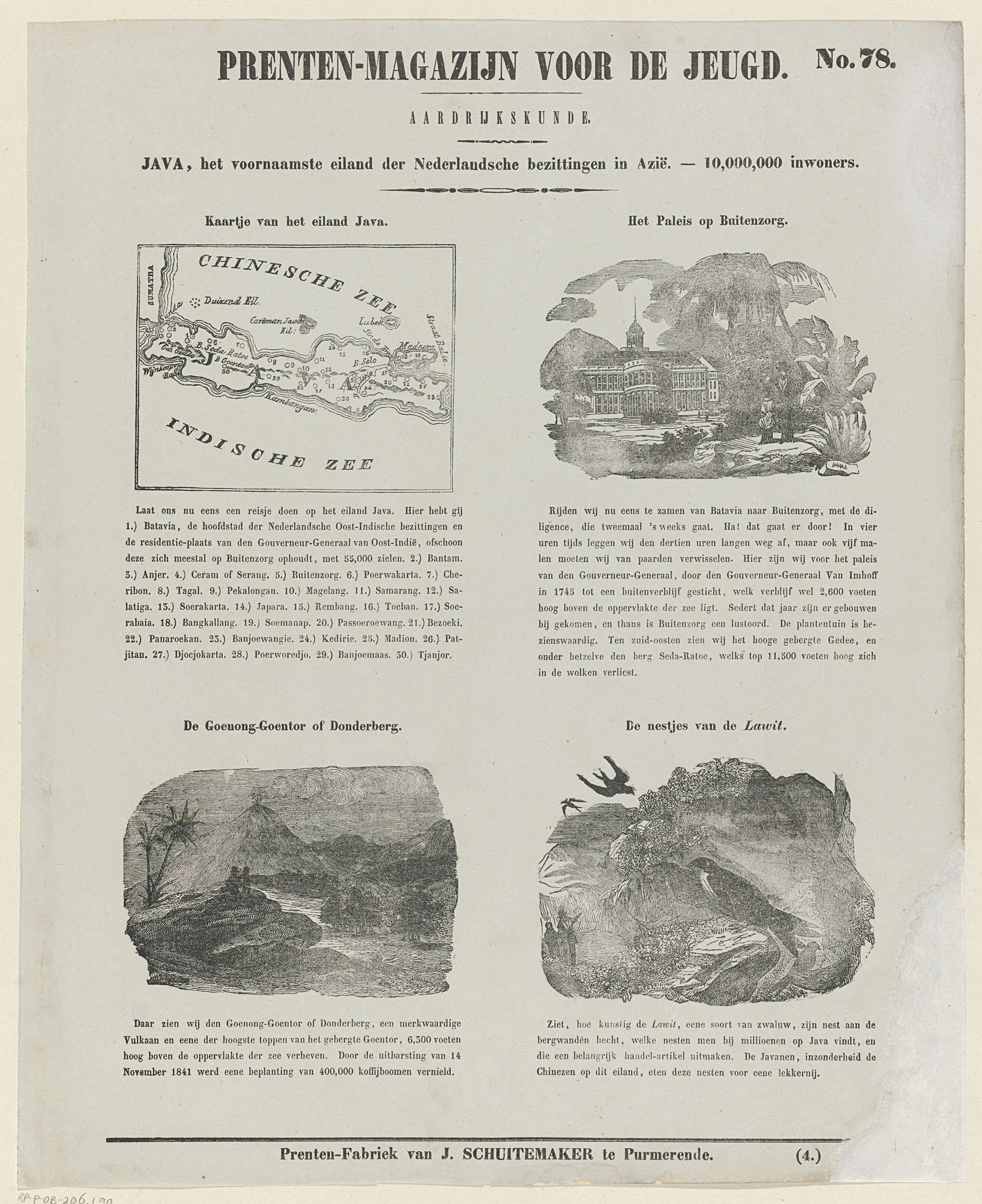Blad met 4 voorstellingen van Java: een kaart, het paleis van de Gouverneur-Generaal in Buitenzorg, de Goenong-Goentor vulkaan en vogels. Boven elke voorstelling een titel en onder elke voorstelling een onderschrift. Genummerd rechtsboven: No. 78, genummerd linksonder: (4.).