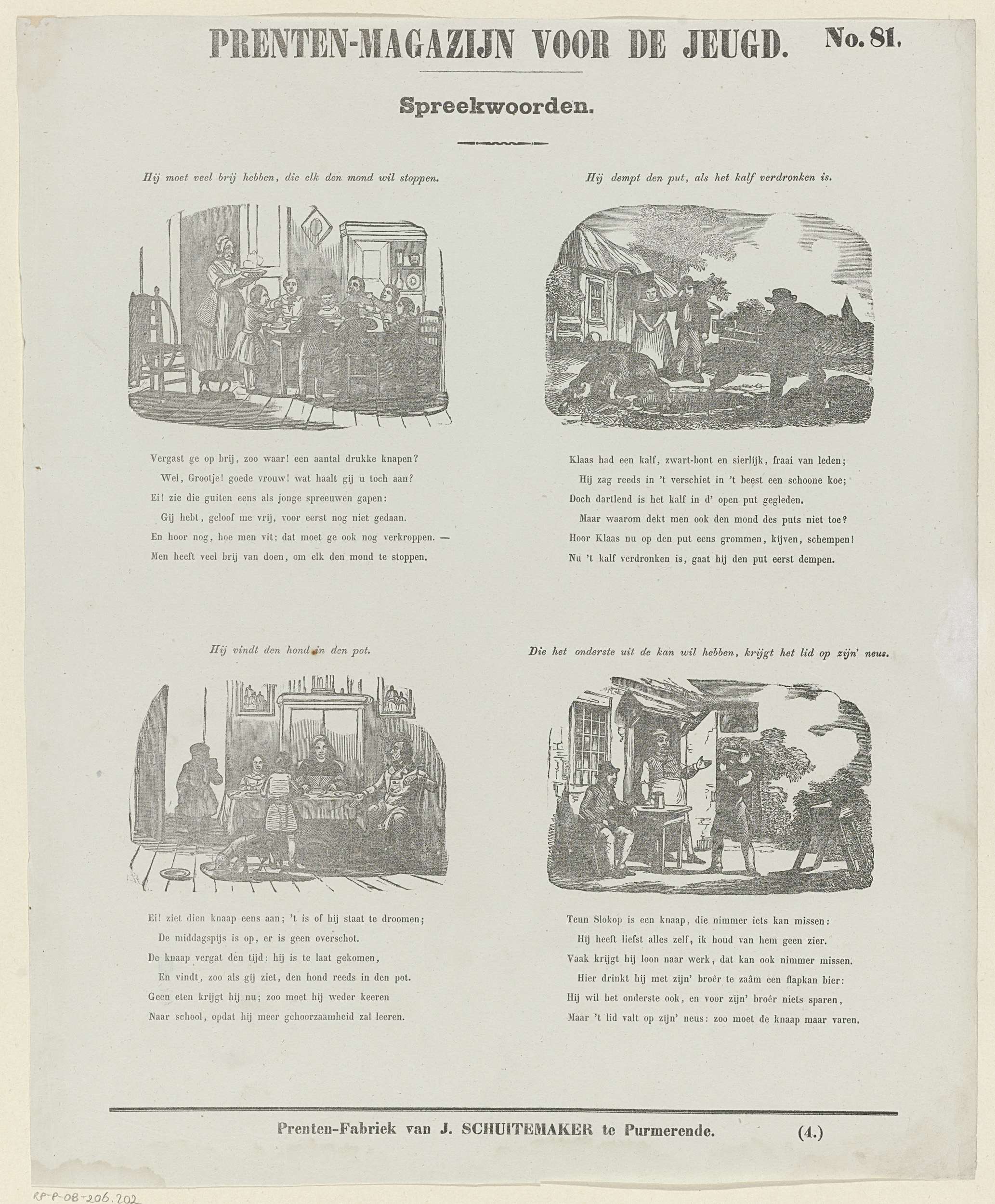 Blad met 4 verbeeldingen van spreekwoorden. Boven elke voorstelling een titel en onder elke voorstelling een zesregelig vers. Genummerd rechtsboven: No. 81, genummerd rechtsonder: (4.).