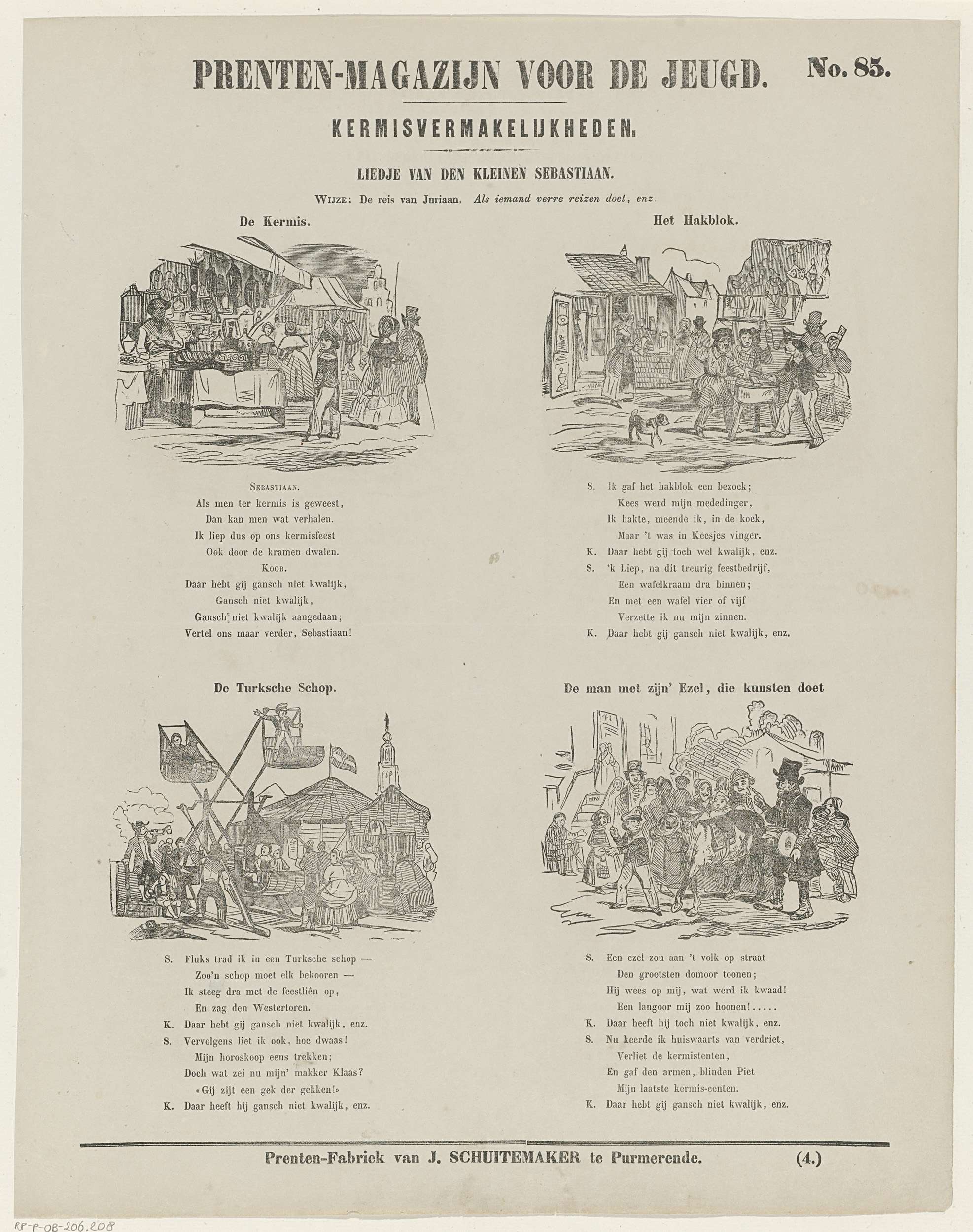Blad met 4 kermistaferelen. Boven elke voorstelling een titel en onder elke voorstelling verzen uit het liedje van de kleine Sebastiaan. Genummerd rechtsboven: No. 85, genummerd rechtsonder: (4.).