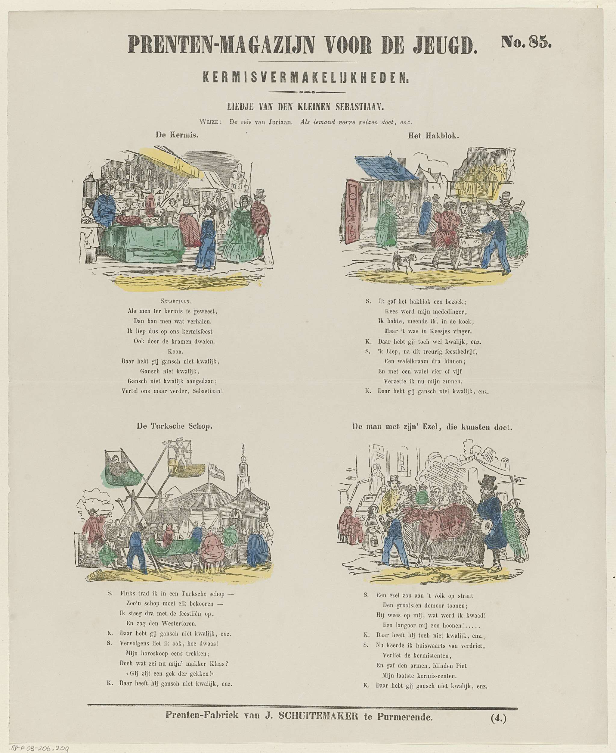 Blad met 4 kermistaferelen. Boven elke voorstelling een titel en onder elke voorstelling verzen uit het liedje van de kleine Sebastiaan. Genummerd rechtsboven: No. 85, genummerd rechtsonder: (4.).