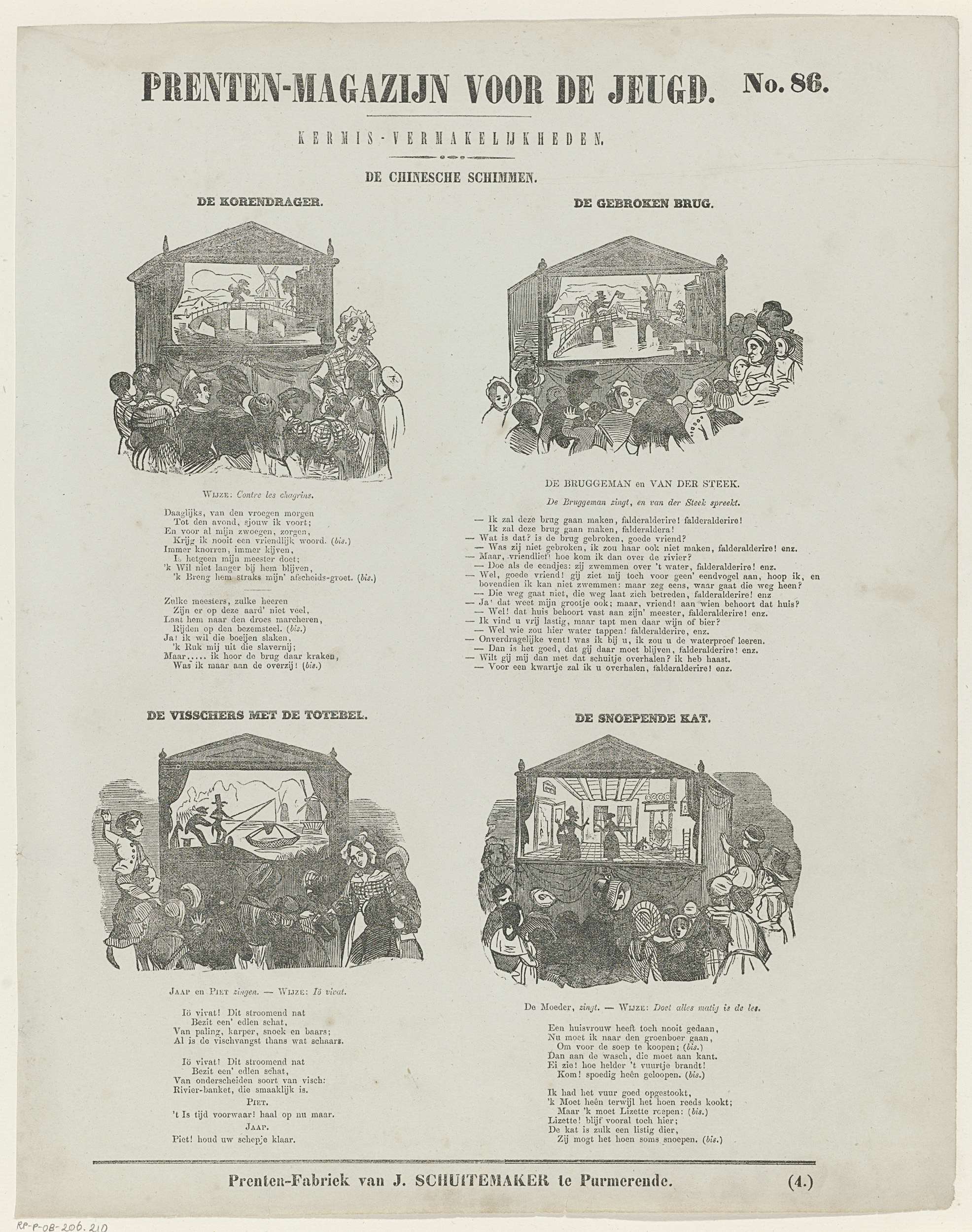 Blad met 4 voorstellingen van schimmenspelen. Boven elke voorstelling een titel en onder elke voorstelling versregels. Genummerd rechtsboven: No. 86, genummerd rechtsonder: (4.).