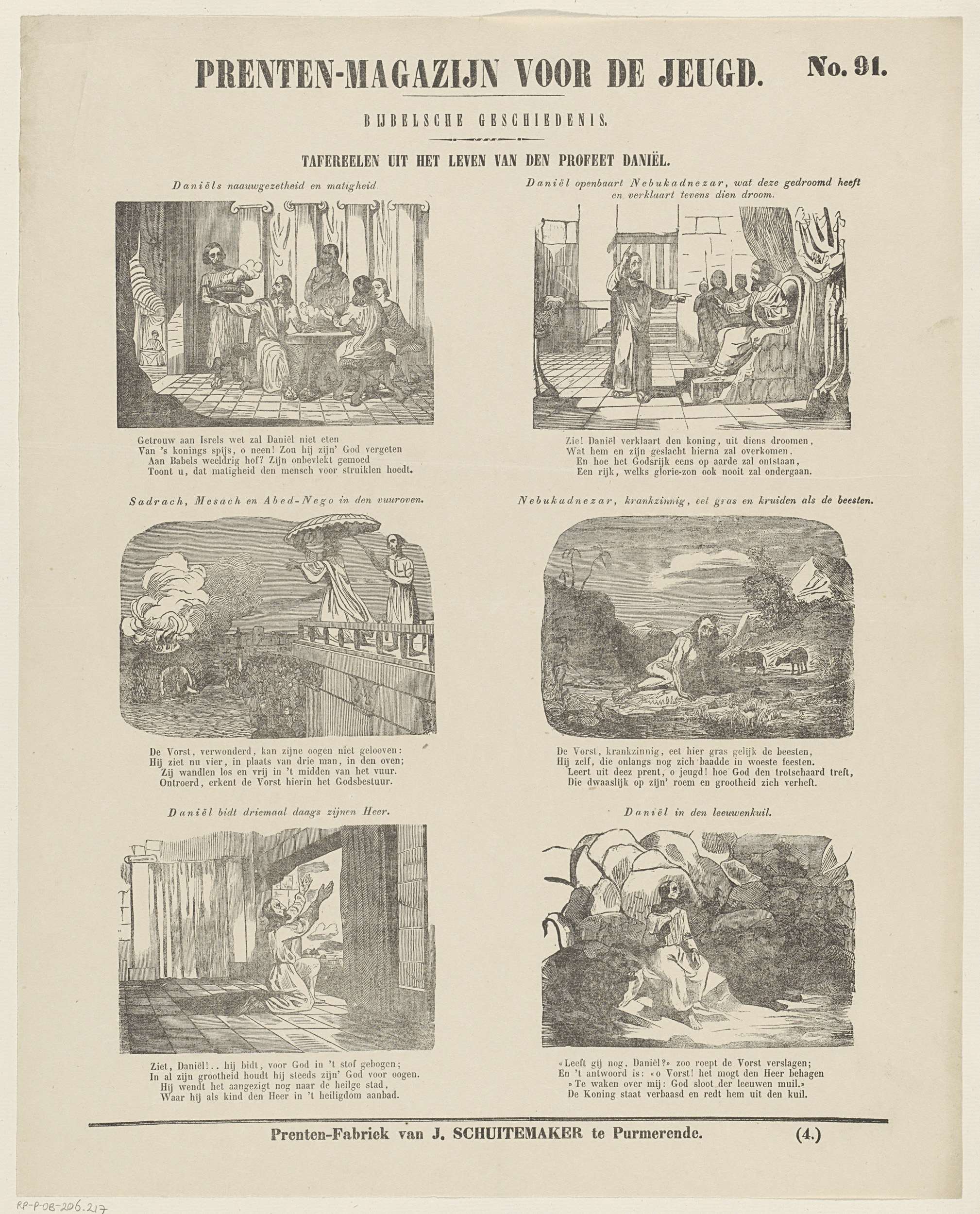 Blad met 6 voorstellingen uit het leven van de oudtestamentische profeet Daniël. Boven elke voorstelling een titel en onder elke voorstelling een vierregelig vers. Genummerd rechtsboven: No. 91, genummerd rechtsonder: (4.).