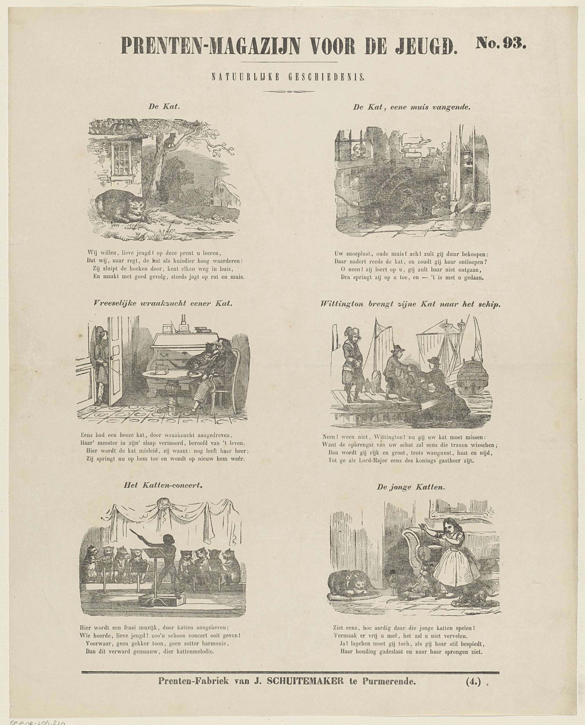 Blad met 6 voorstellingen van katten. Boven elke voorstelling een titel en onder elke voorstelling een vierregelig vers. Genummerd rechtsboven: No. 93, genummerd rechtsonder: (4.).