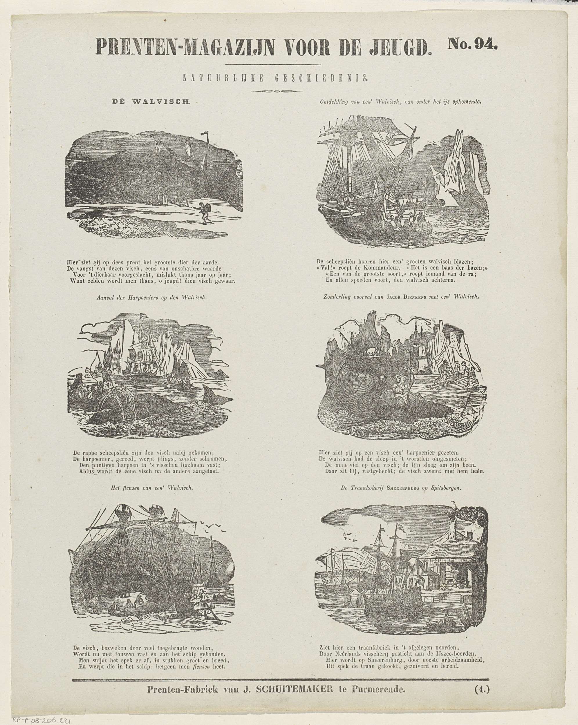 Blad met 6 voorstellingen van de walvisvangst. Boven elke voorstelling een titel en onder elke voorstelling een vierregelig vers. Genummerd rechtsboven: No. 94, genummerd rechtsonder: (4.).