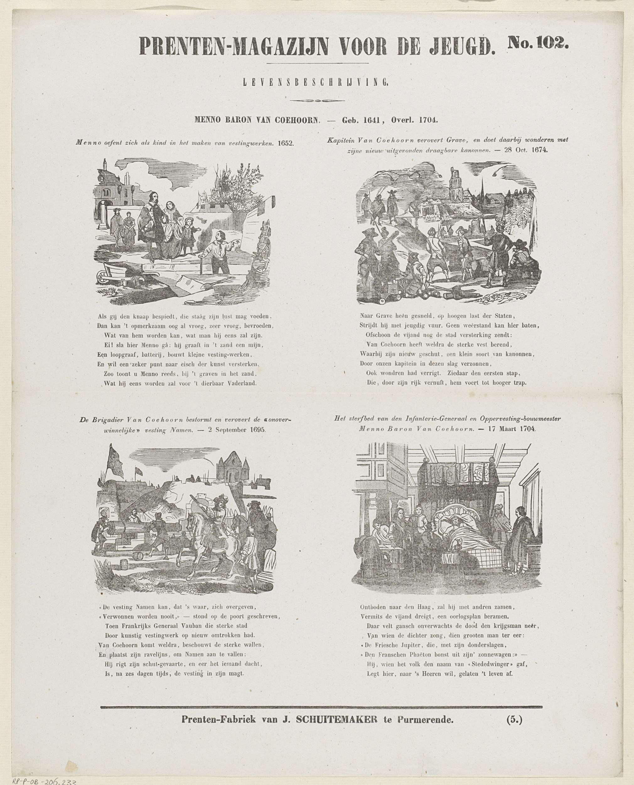 Blad met 4 voorstellingen uit het leven van Menno, baron van Coehoorn. Boven elke voorstelling een titel en onder elke voorstelling een achtregelig vers. Genummerd rechtsboven: No. 102, genummerd rechtsonder: (5.).