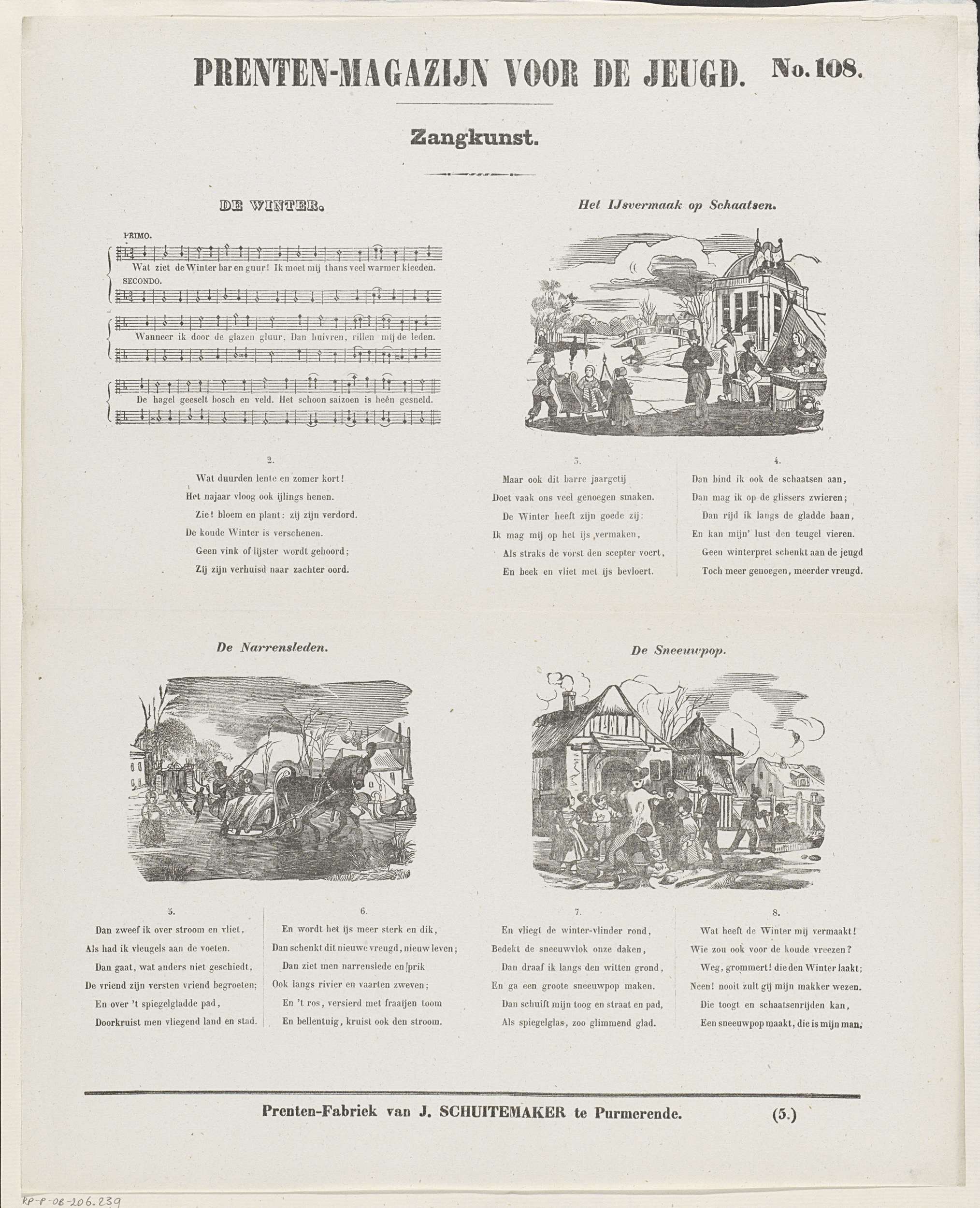 Blad met 3 voorstellingen en een stuk bladmuziek met een lied over de winter. Boven elke voorstelling een titel en onder elke voorstelling coupletten van het lied. Genummerd rechtsboven: No. 108, genummerd rechtsonder: (5.).