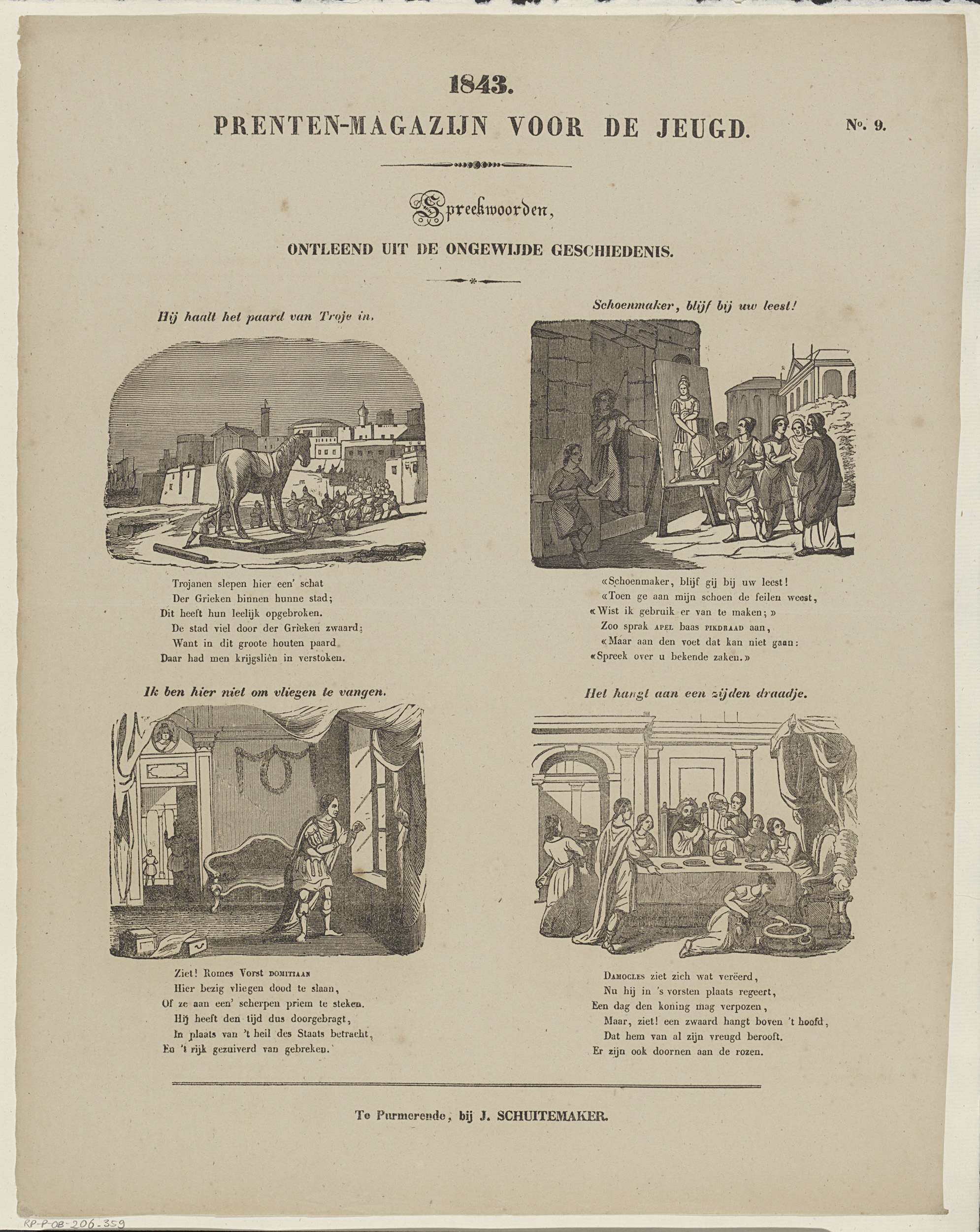 Blad met 4 verbeeldingen van spreekwoorden, gebaseerd op historische verhalen. Boven elke voorstelling een titel en onder elke voorstelling een zesregelig vers. Genummerd rechtsboven: No. 9.