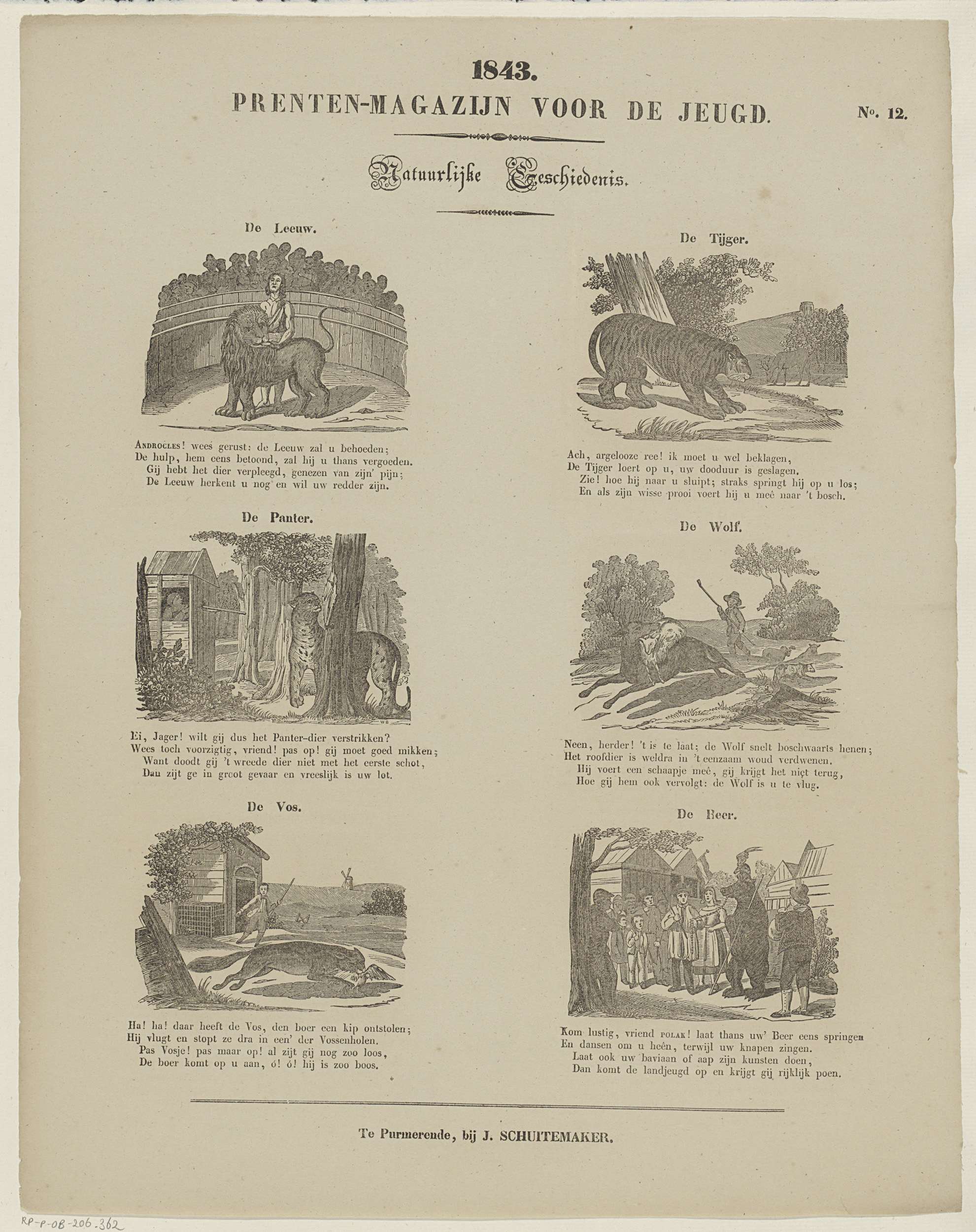 Blad met 6 voorstellingen van verschillende dieren: een leeuw, een tijger, een panter, een wolf, een vos en een beer. Boven elke voorstelling een titel en onder elke voorstelling een vierregelig vers. Genummerd rechtsboven: No. 12.