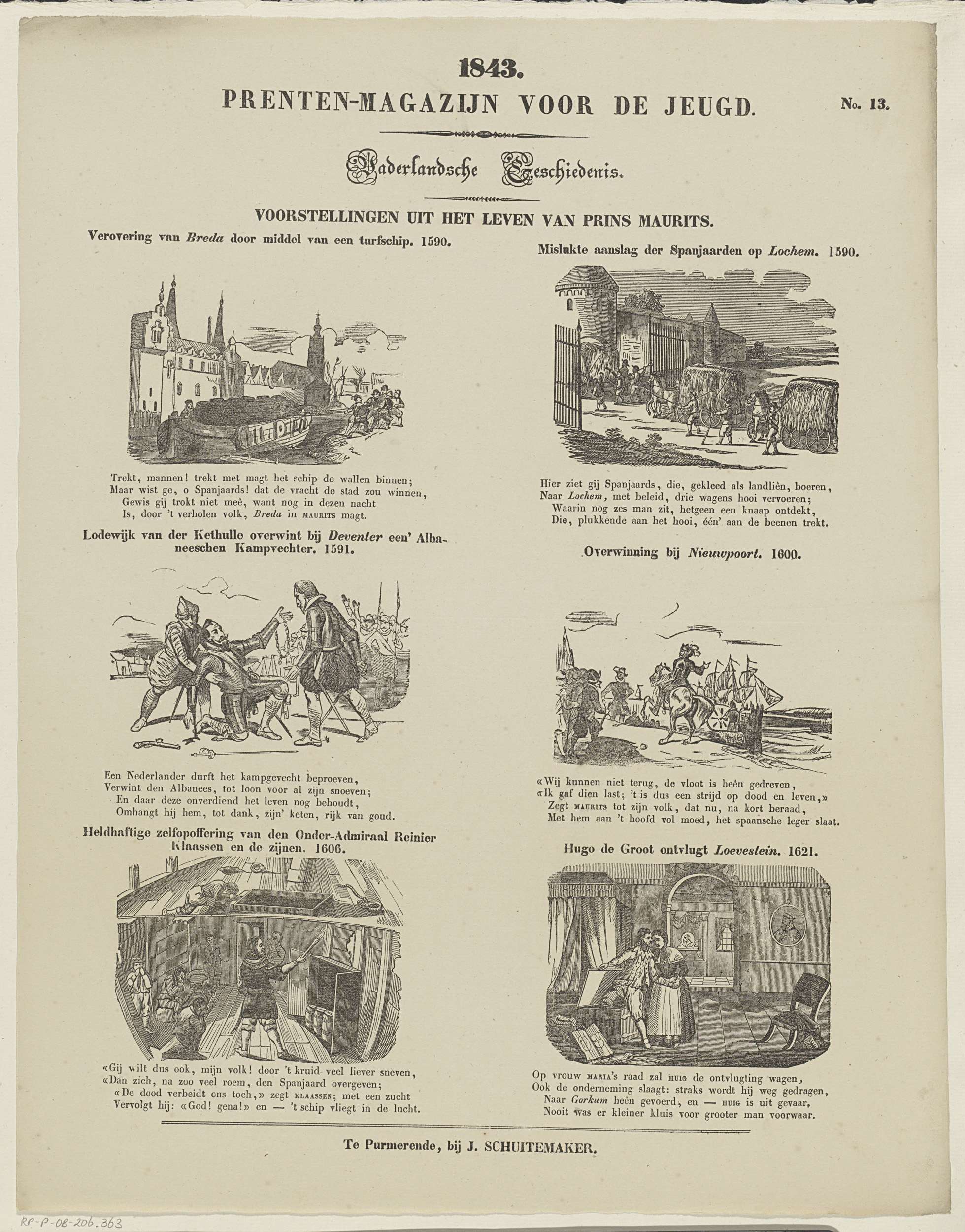 Blad met 6 voorstellingen van gebeurtenissen uit de vaderlandse geschiedenis, ten tijde van prins Maurits. Boven elke voorstelling een titel en onder elke voorstelling een vierregelig vers. Genummerd rechtsboven: No. 13.