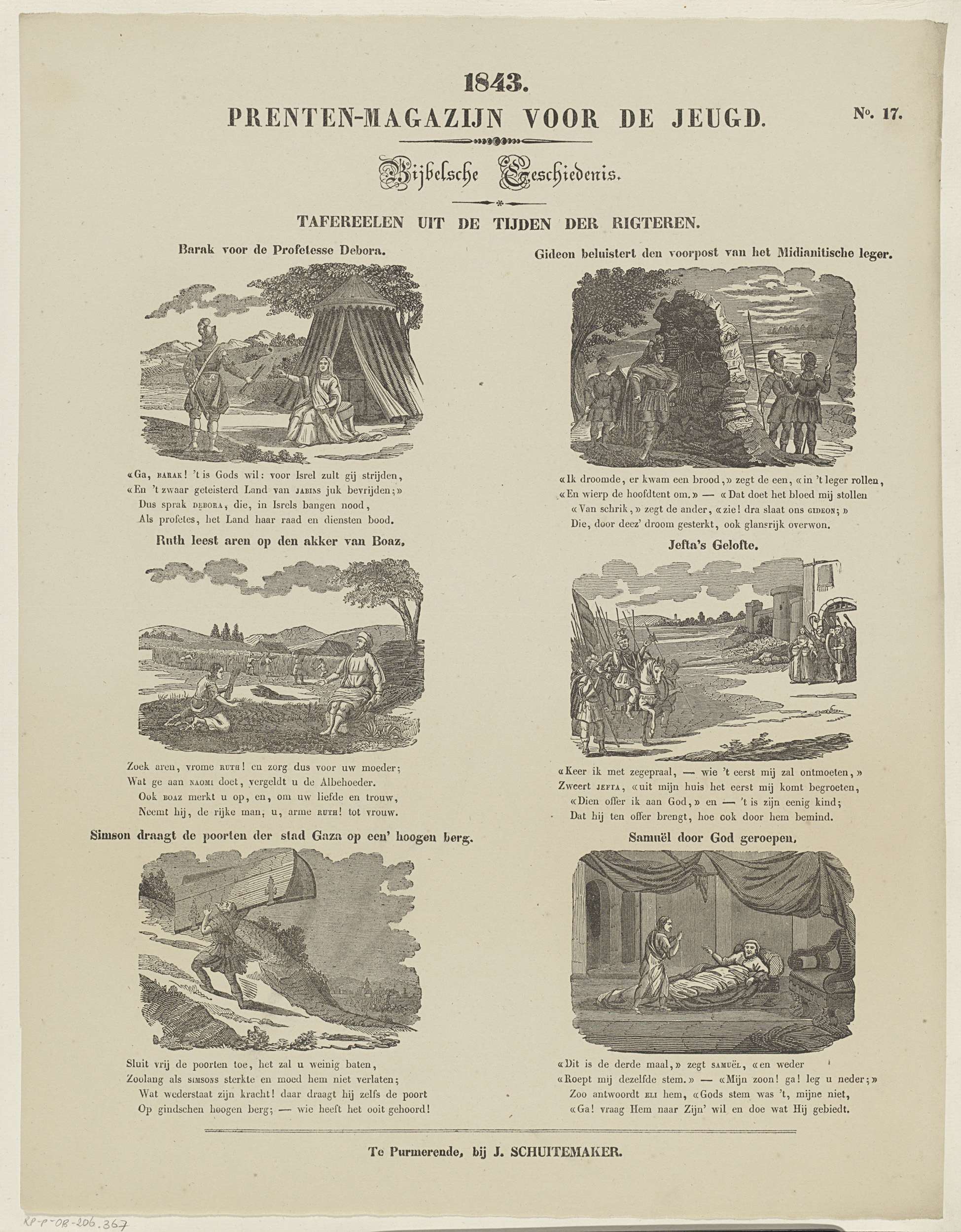 Blad met 6 voorstellingen van verhalen uit het Oude Testament. Boven elke voorstelling een titel en onder elke voorstelling een vierregelig vers. Genummerd rechtsboven: No. 17.