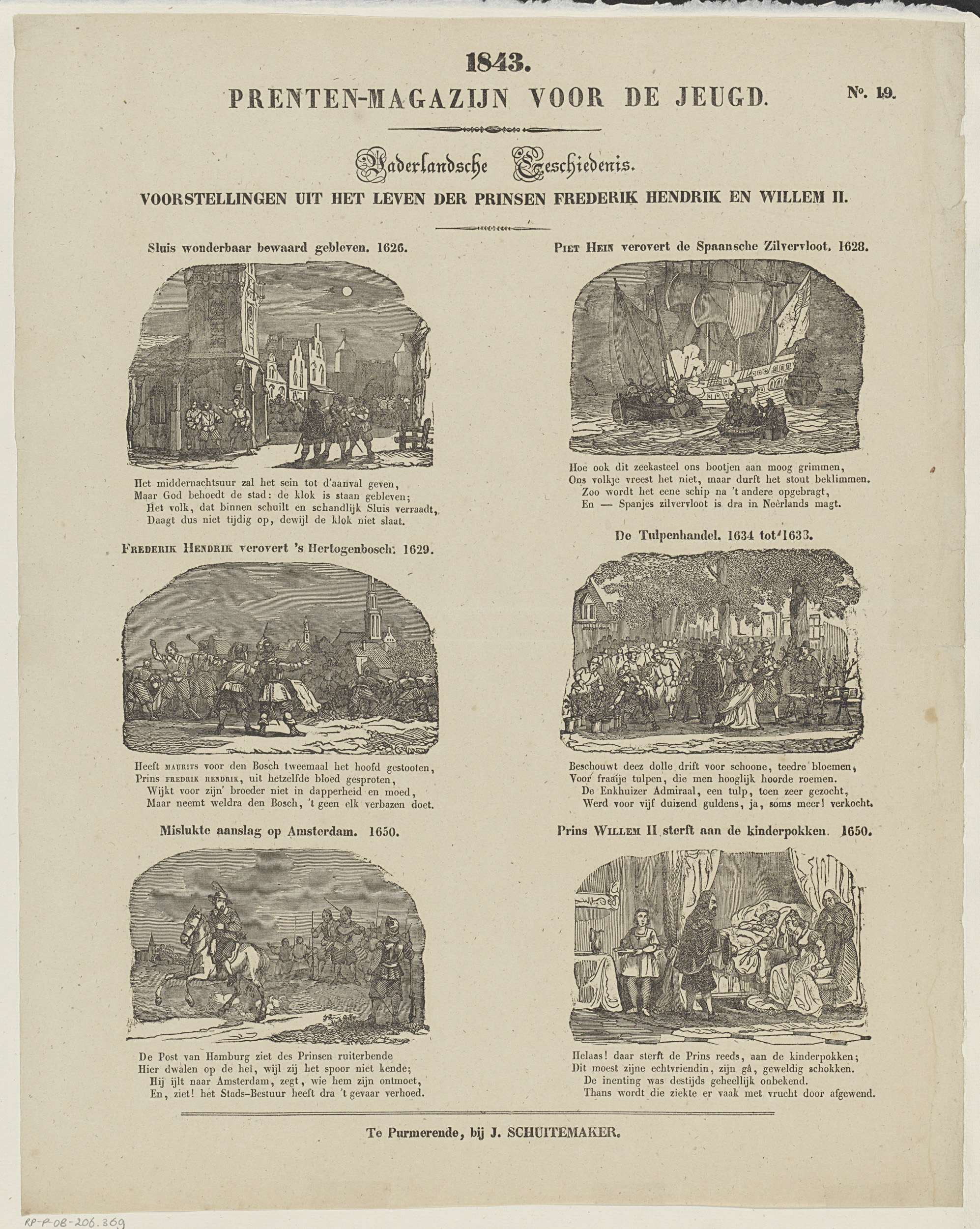 Blad met 6 voorstellingen van gebeurtenissen uit de vaderlandse geschiedenis. Boven elke voorstelling een titel en onder elke voorstelling een vierregelig vers. Genummerd rechtsboven: No. 19.