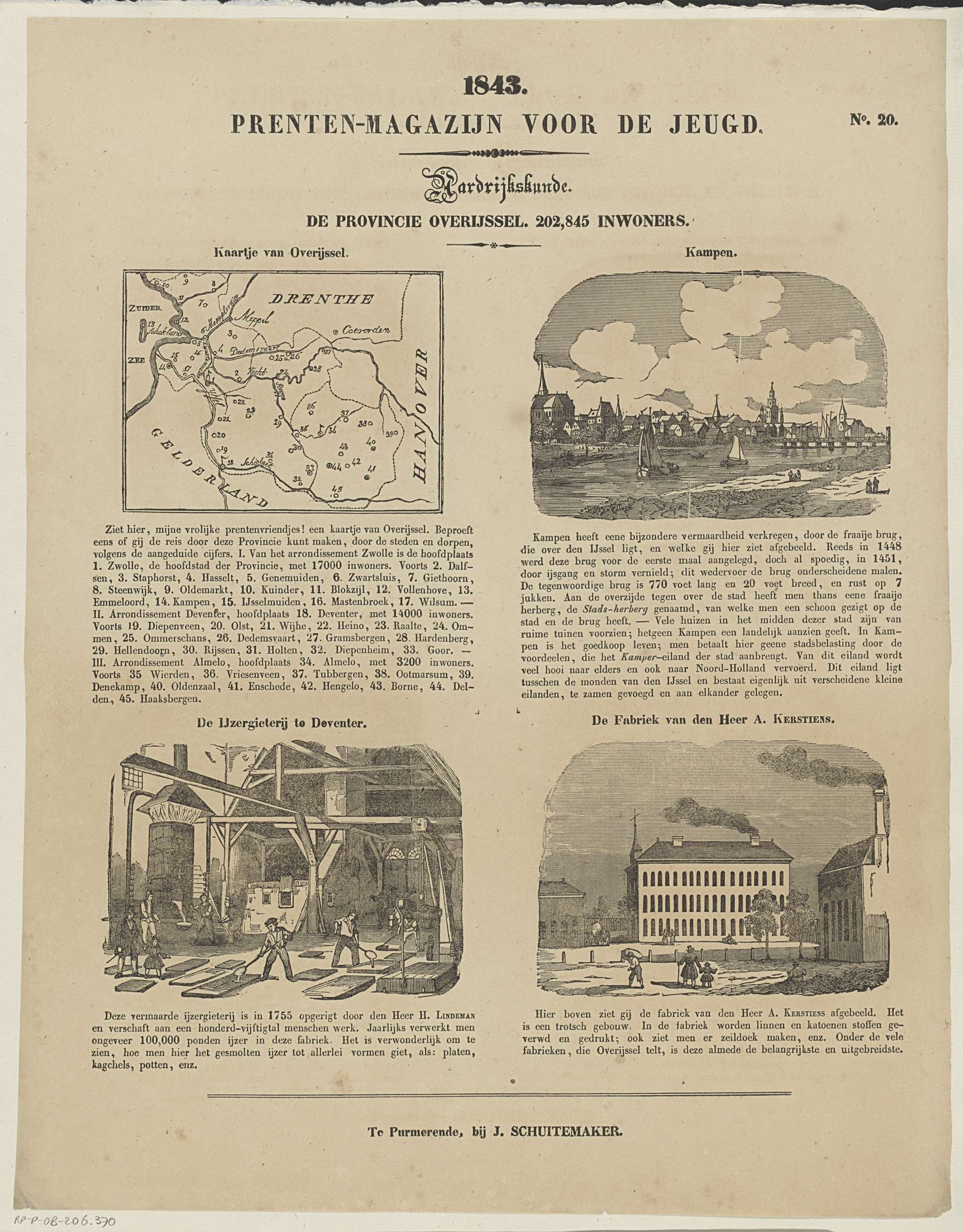 Blad met 4 voorstellingen over de provincie Overijssel met een kaart en belangrijke gebouwen en plaatsen: Kampen, de ijzergieterij in Deventer en de fabriek van de heer A. Kerstiens in Oldenzaal. Boven elke voorstelling een titel en onder elke voorstelling een onderschrift. Genummerd rechtsboven: No. 20.