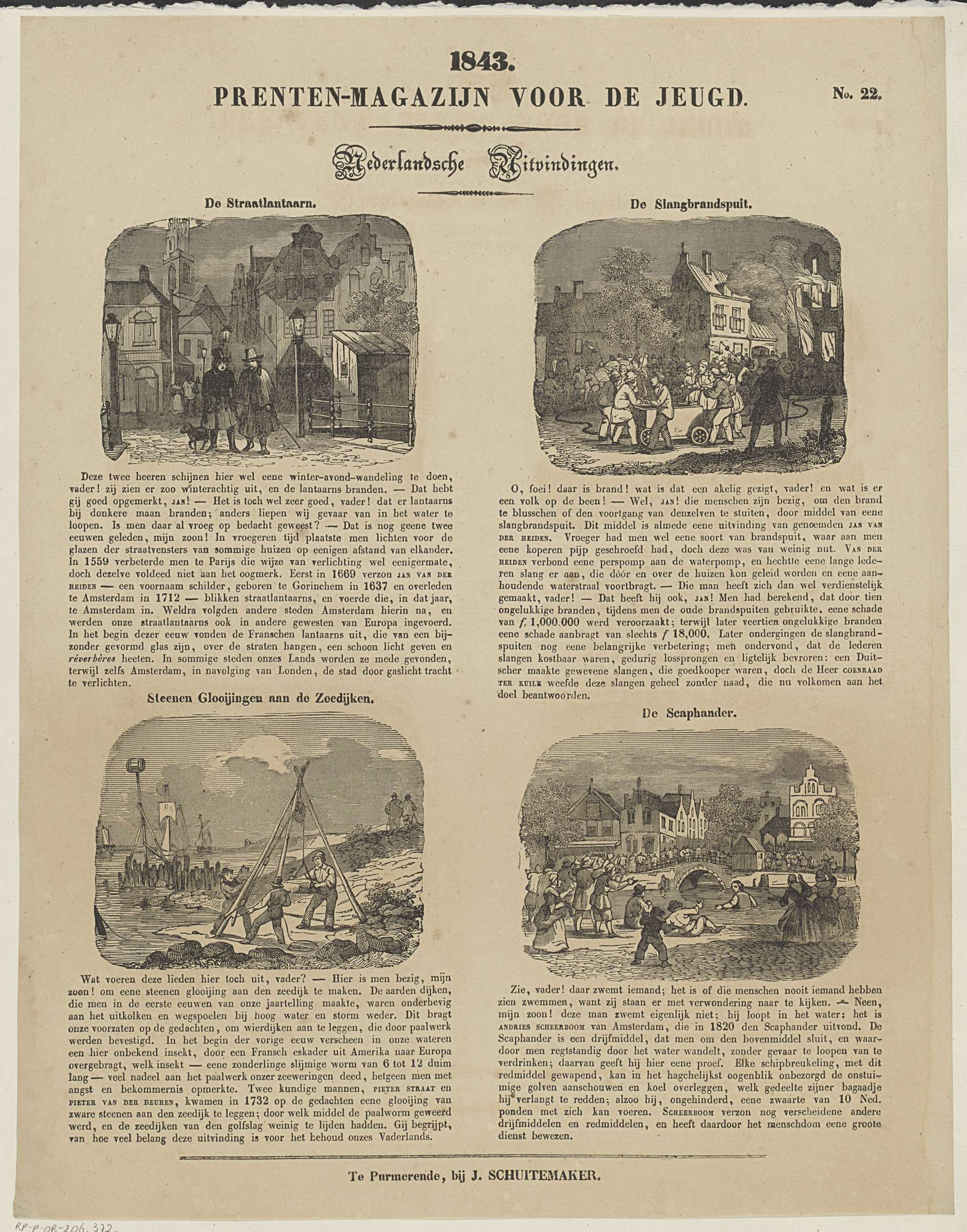 Blad met 4 voorstellingen van Nederlandse uitvindingen en ontdekkingen: de straatlantaarn, de slangbrandspuit, stenen glooiingen aan de zeedijken en de scaphander (zwemgordel). Boven elke voorstelling een titel en onder elke voorstelling een onderschrift. Genummerd rechtsboven: No. 22