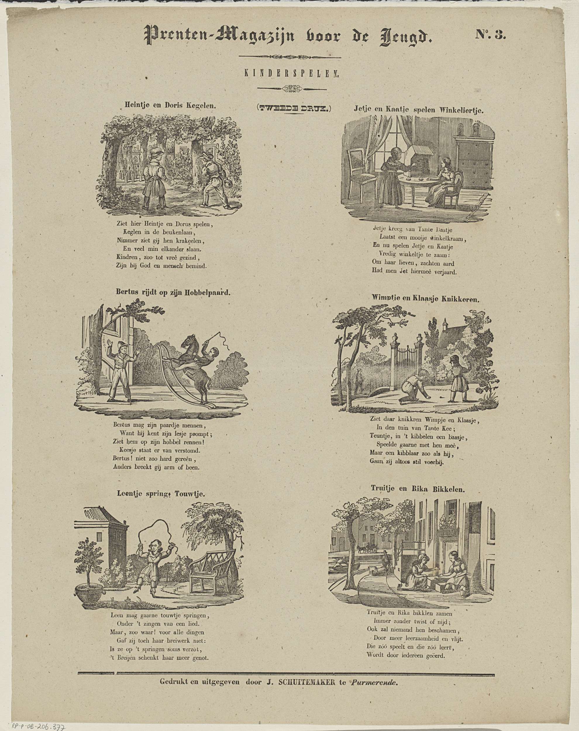 Blad met 6 voorstellingen van kinderspelen, zoals kegelen, knikkeren en touwtjespringen. Boven elke voorstelling een titel en onder elke voorstelling een zesregelig vers. Genummerd rechtsboven: No. 3.