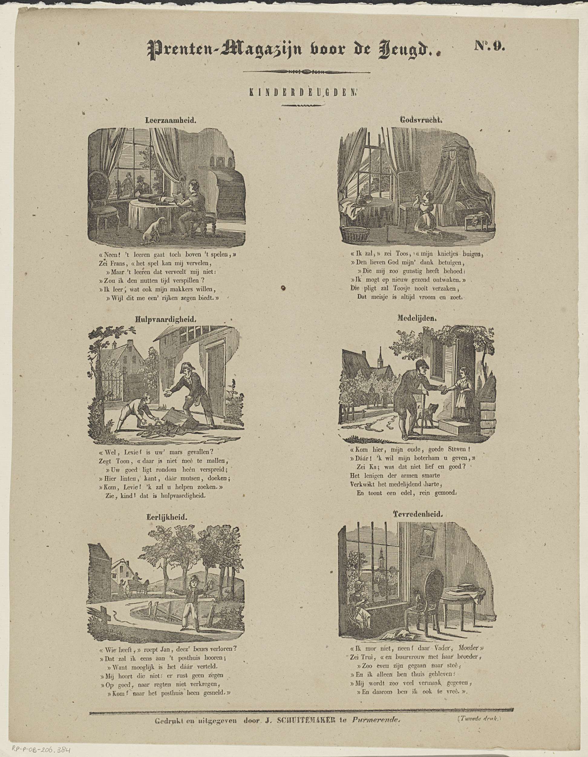 Blad met 6 voorstellingen van kinderdeugden, zoals leerzaamheid, godsvrucht en hulpvaardigheid. Boven elke voorstelling een titel en onder elke voorstelling een zesregelig vers. Genummerd rechtsboven: No. 9.