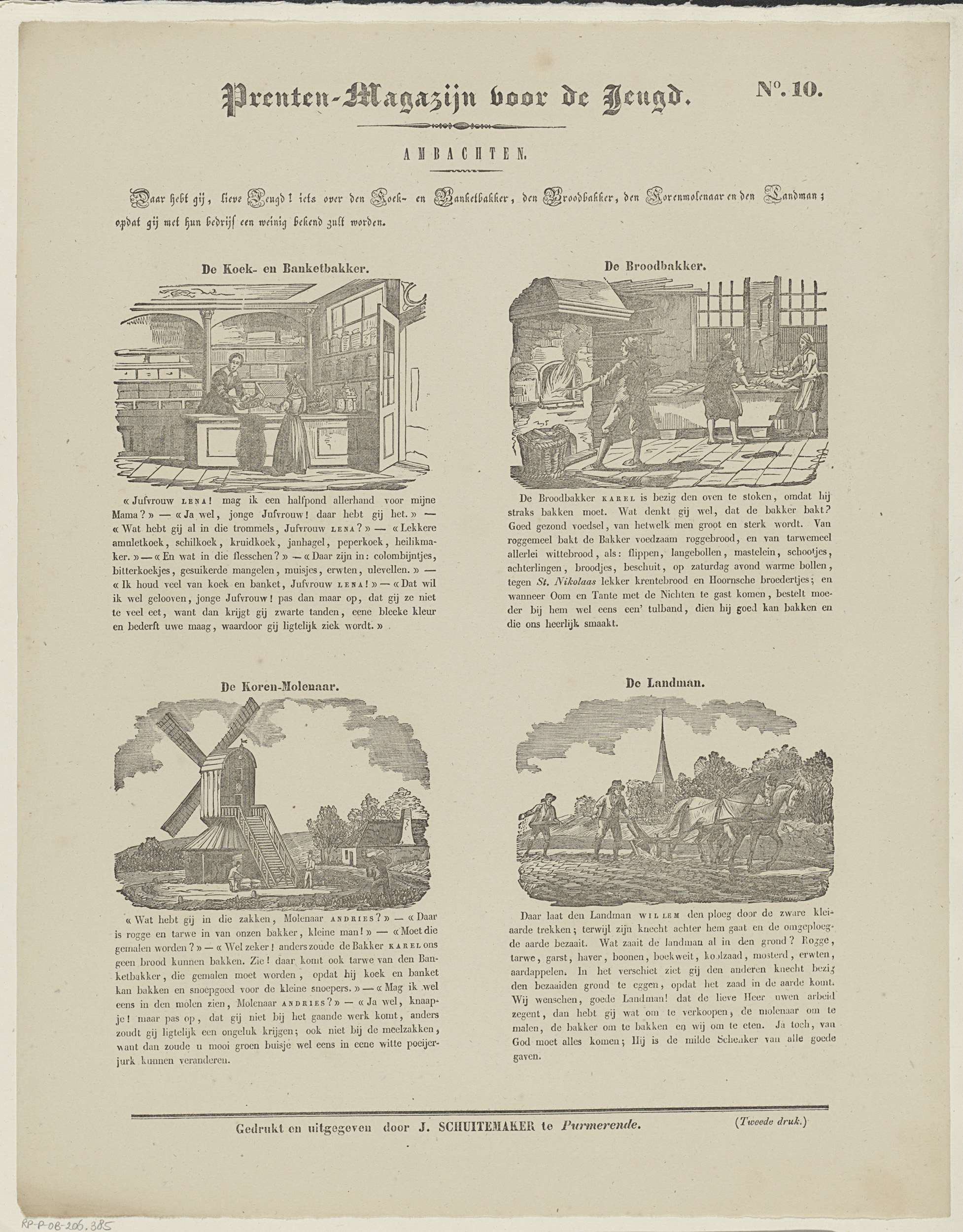 Blad met 4 voorstellingen van ambachtslieden: een koek- en banketbakker, een broodbakker, een molenaar en een boer. Boven elke voorstelling een titel en onder elke voorstelling negen tot tien regels tekst. Genummerd rechtsboven: No. 10.