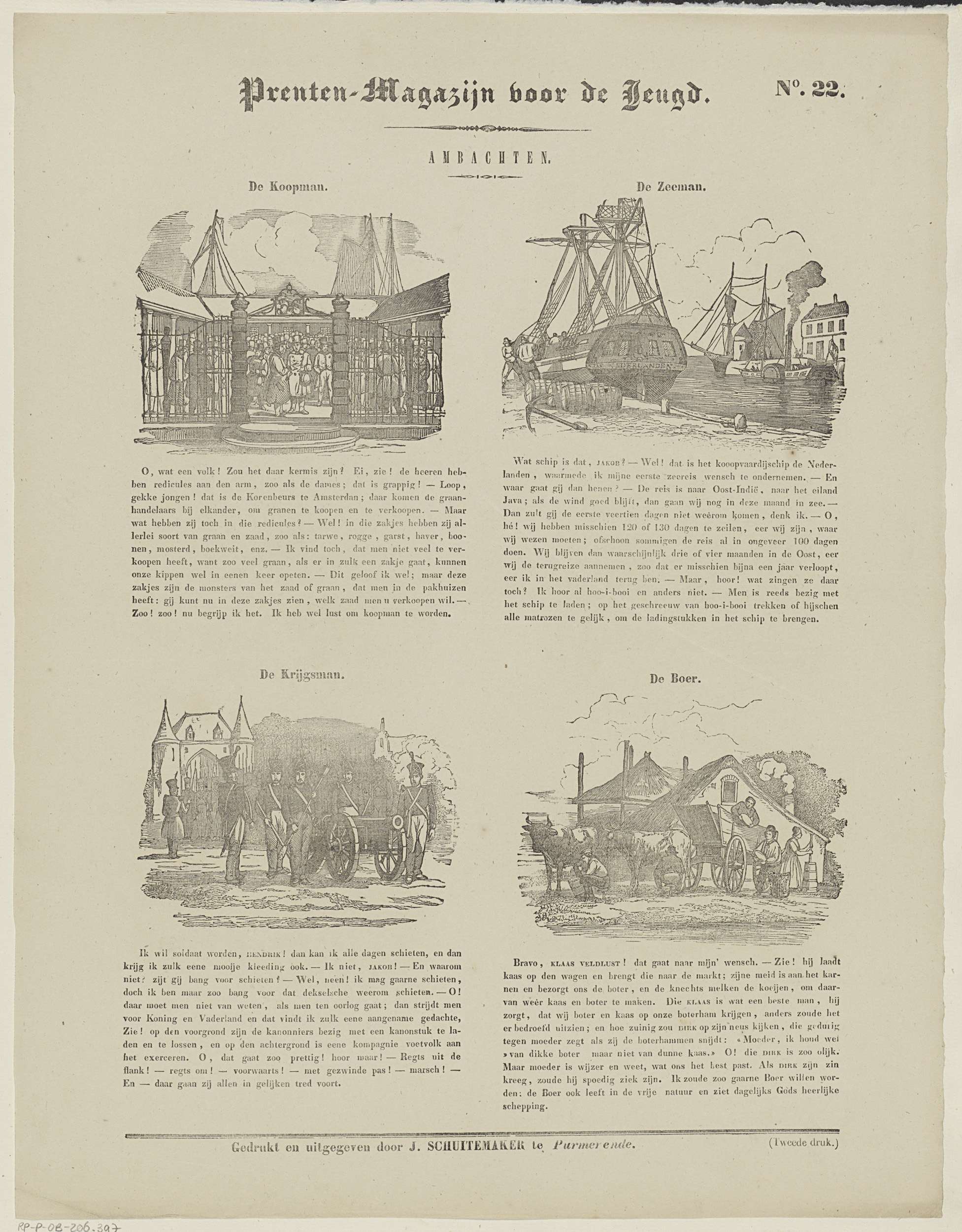 Blad met 4 voorstellingen van ambachtslieden en beroepen: koopman, zeeman, soldaat en boer. Boven elke voorstelling een titel, onder elke voorstelling tien tot twaalf regels tekst. Genummerd rechtsboven: No. 16, genummerd rechtsonder: (1.).