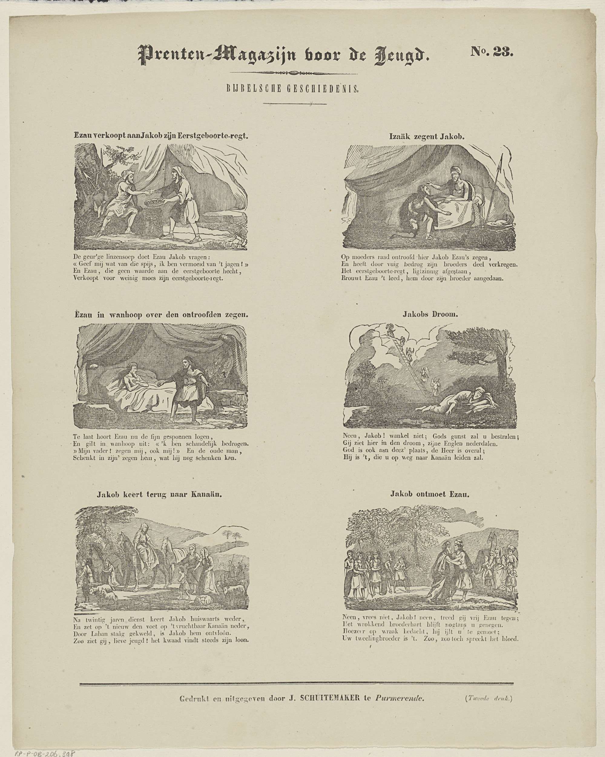 Blad met 6 voorstellingen uit het verhaal van Jakob uit het Oude Testament, waaronder Isaak die Jakob zegent, Jakobs droom en Jakob die terugkeert naar Kanaän. Boven elke voorstelling een titel, onder elke voorstelling een vierregelig vers. Genummerd rechtsboven: No. 23.
