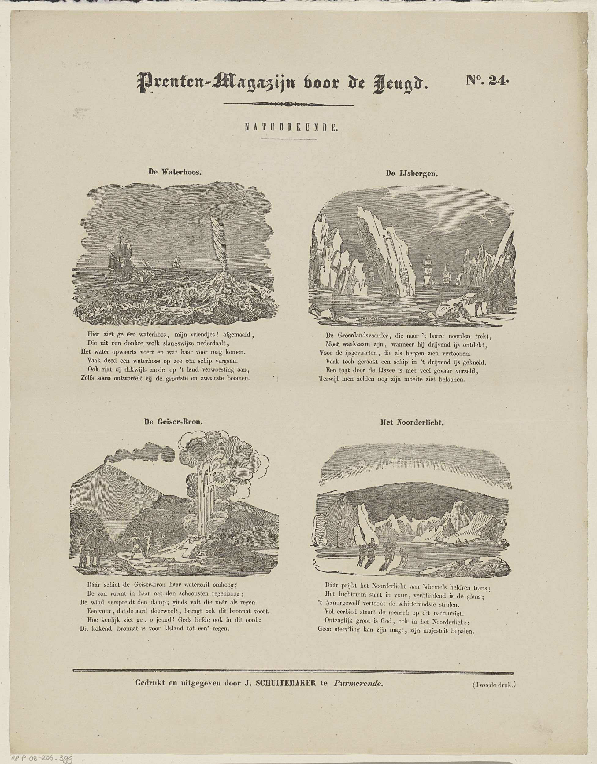 Blad met 4 voorstellingen van natuurfenomenen: een waterhoos, ijsbergen, een geiser en het noorderlicht. Boven elke voorstelling een titel en onder elke voorstelling een zesregelig vers. Genummerd rechtsboven: No. 24.