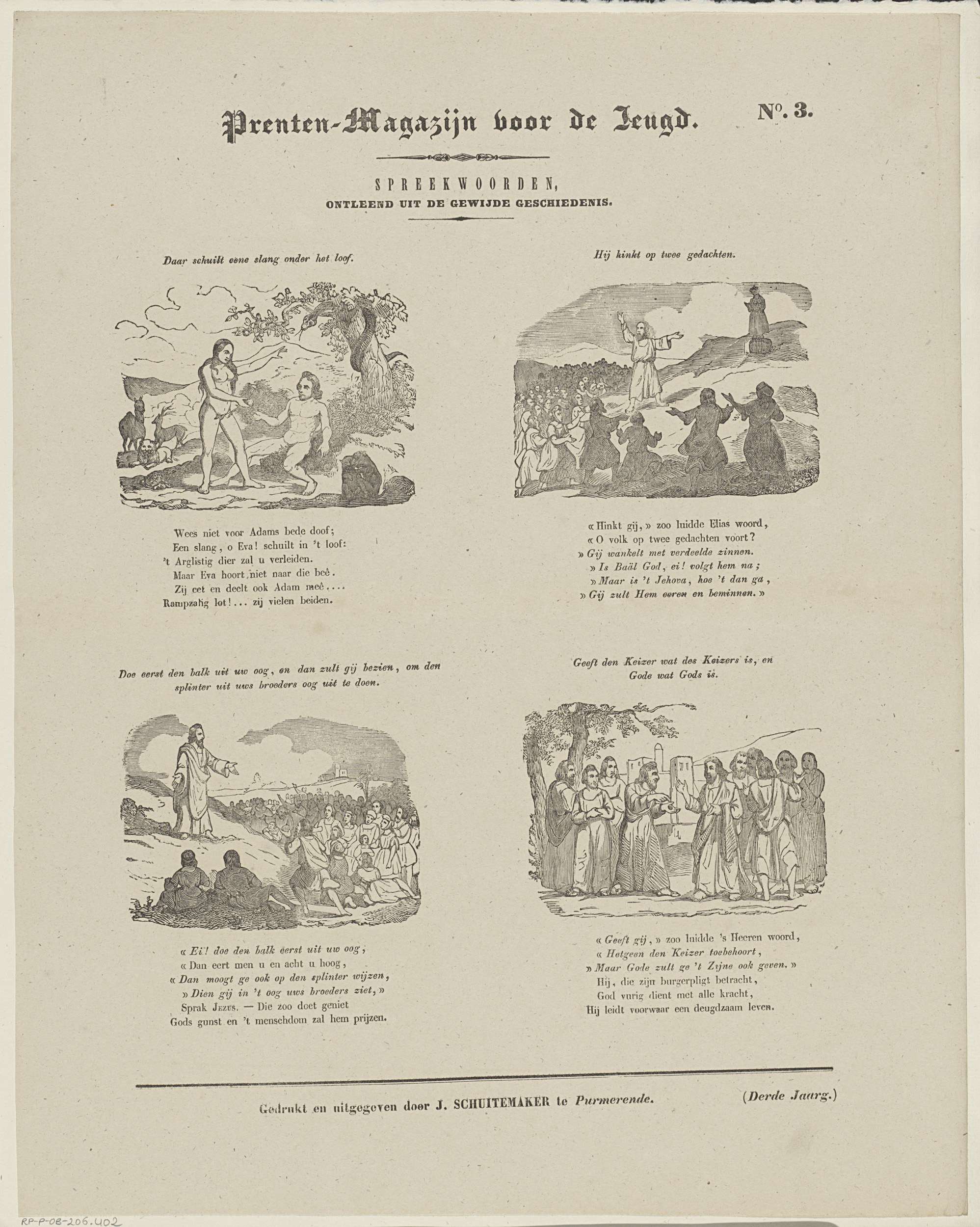 Blad met 4 verbeeldingen van spreekwoorden, gebaseerd op verhalen uit de Bijbel. Boven elke voorstelling een titel en een verwijzing naar de bijbehorende Bijbeltekst en onder elke voorstelling een zesregelig vers. Genummerd rechtsboven: No. 3.