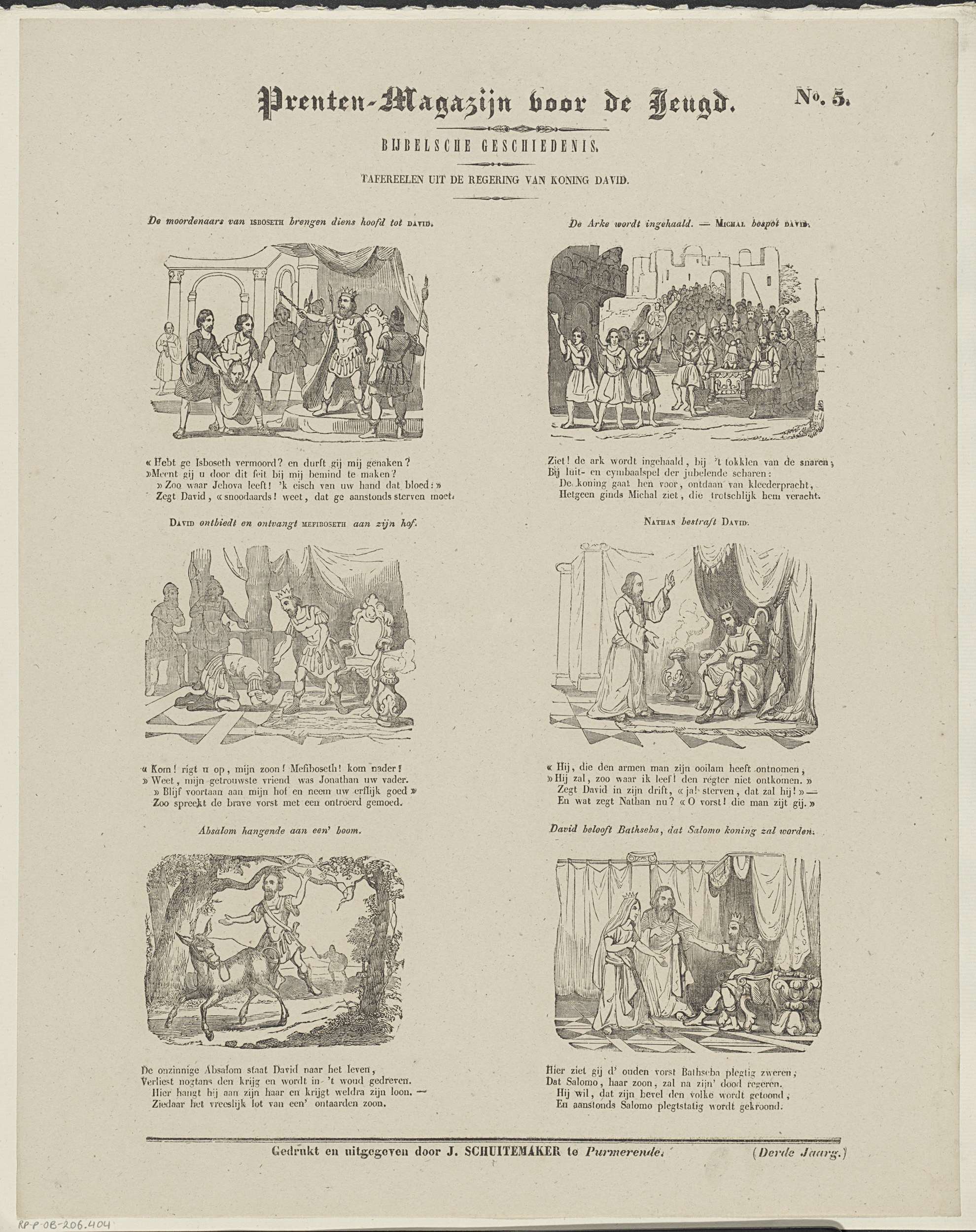Blad met 6 voorstellingen uit het leven van de oudtestamentische koning David. Boven elke voorstelling een titel en onder elke voorstelling een vierregelig vers. Genummerd rechtsboven: No. 5.