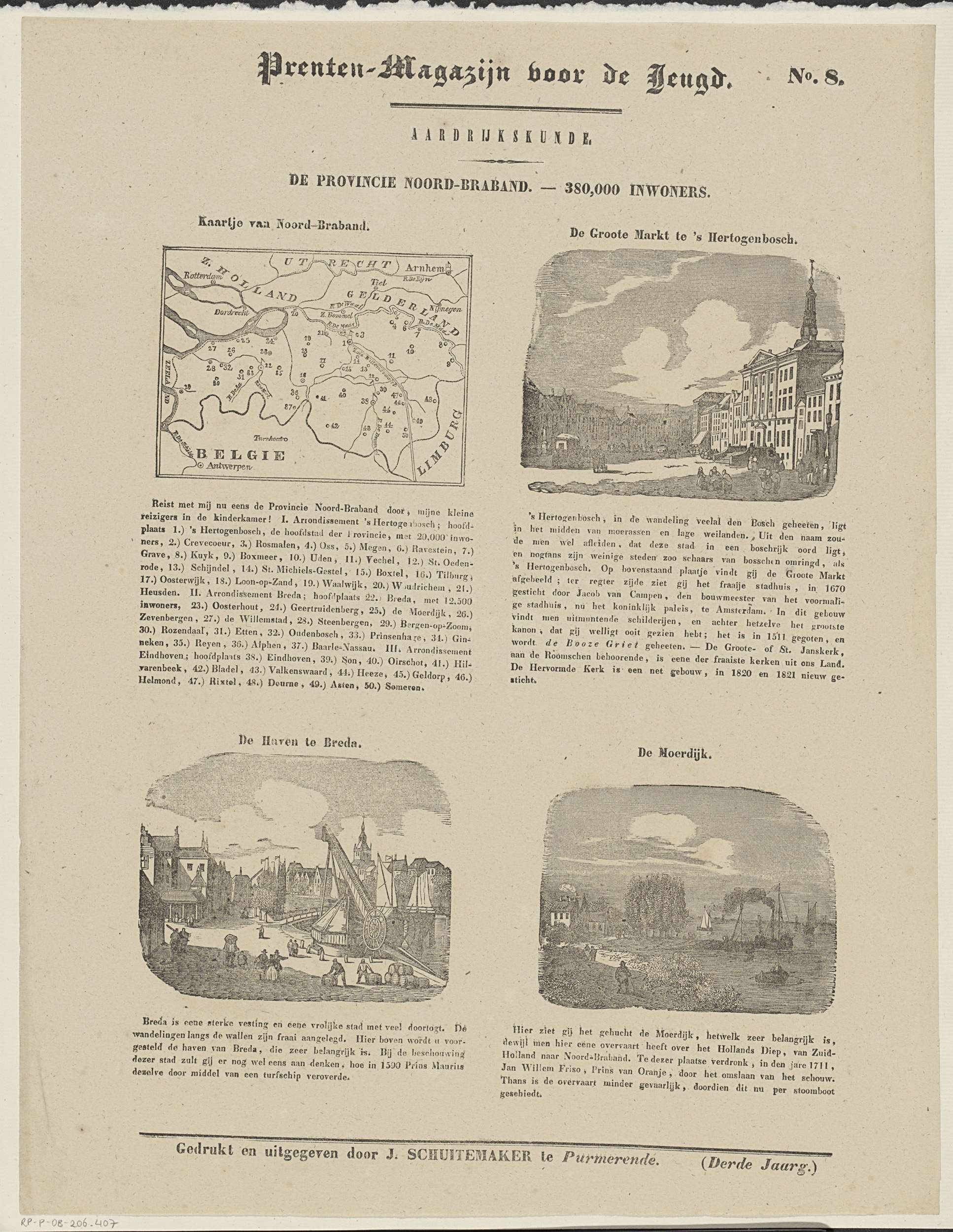 Blad met 4 voorstellingen over de provincie Noord-Brabant met een kaart en belangrijke plaatsen: de Grote Markt in Den Bosch, de haven van Breda en Moerdijk. Boven elke voorstelling een titel en onder elke voorstelling een onderschrift. Genummerd rechtsboven: No. 8.