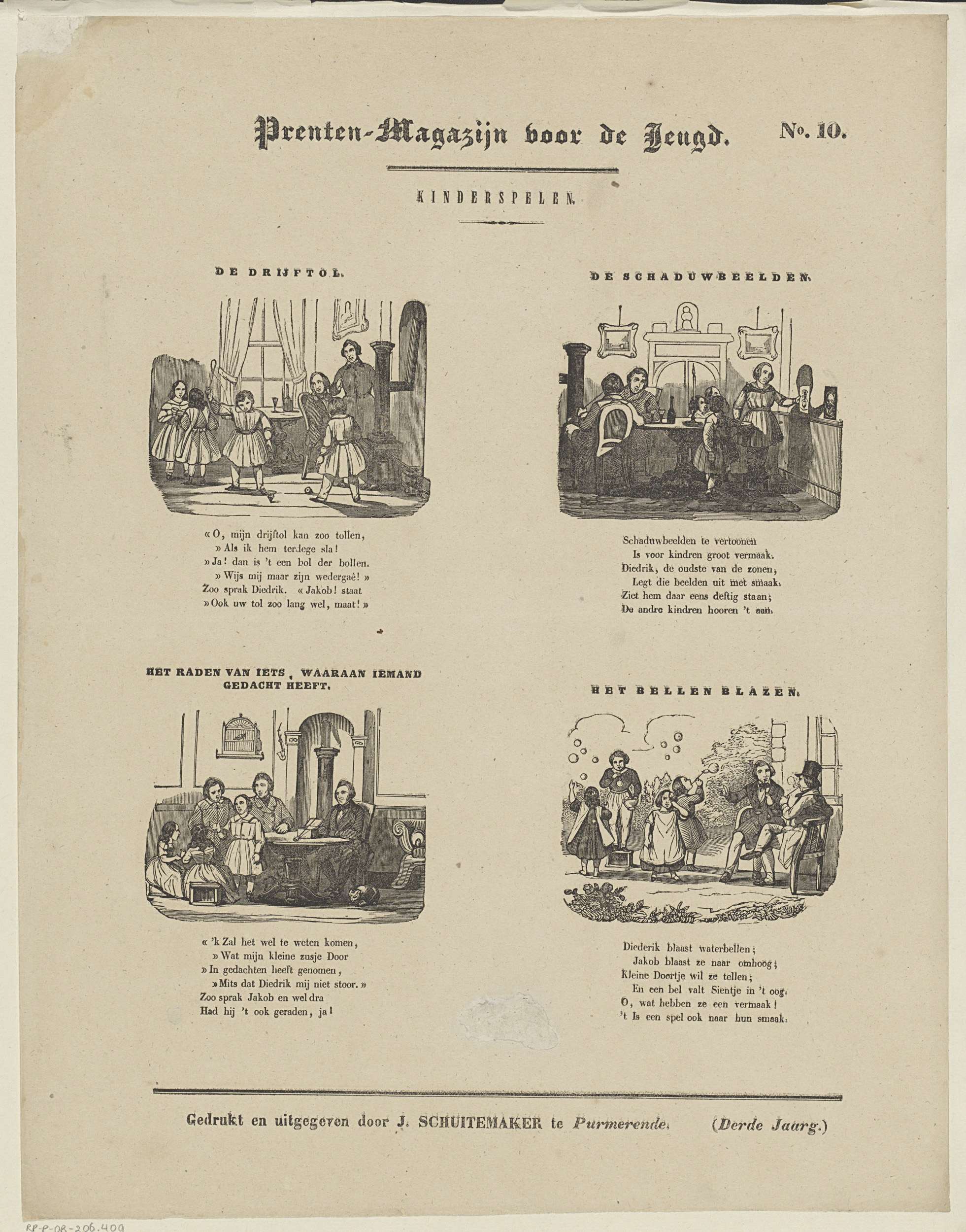 Blad met 4 voorstellingen van kinderspelen, zoals tollen en bellenblazen. Boven elke voorstelling een titel en onder elke voorstelling een zesregelig vers. Genummerd rechtsboven: No. 10.
