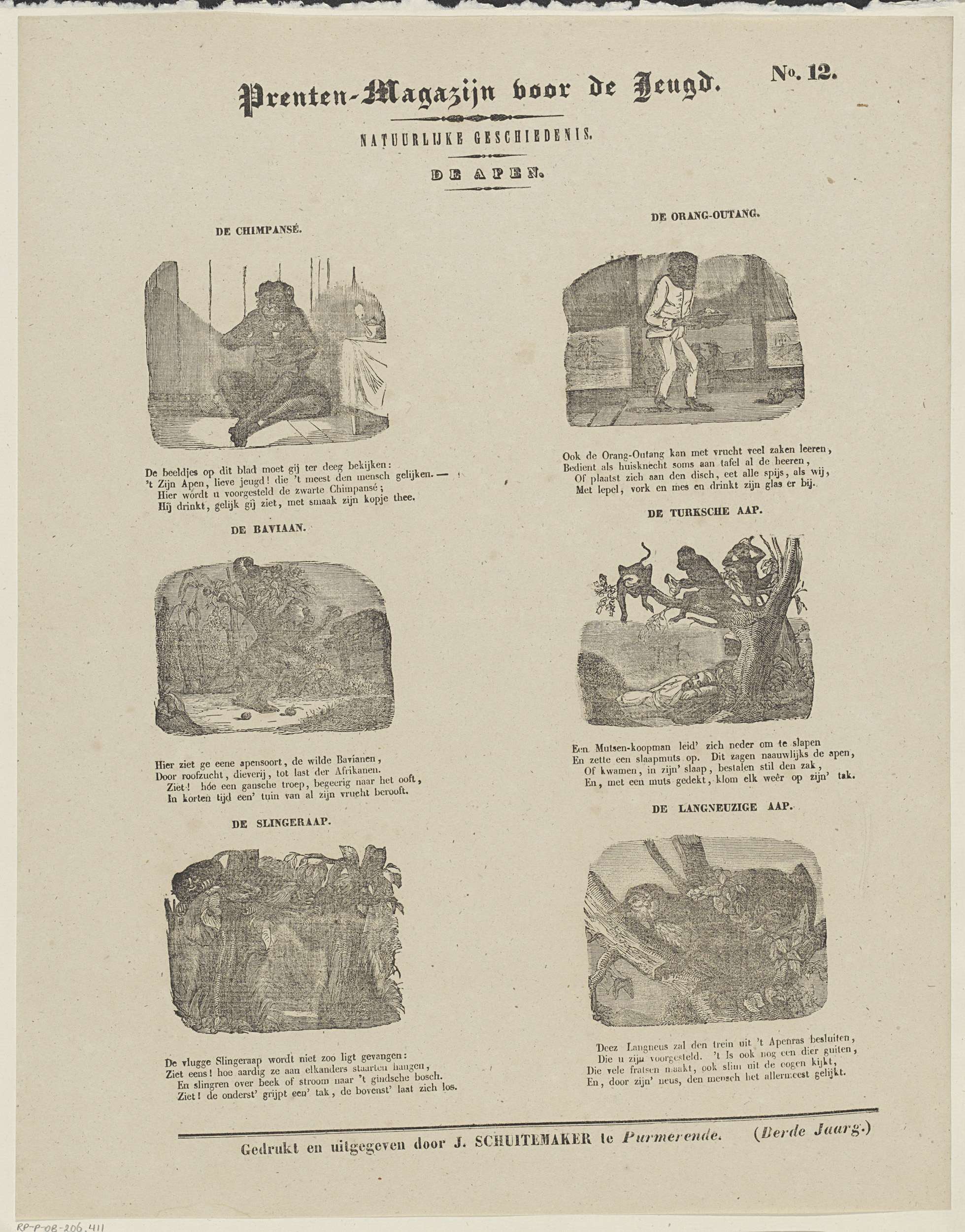 Blad met 6 voorstellingen van verschillende apen, zoals een chimpansee, een baviaan en een slingeraap. Boven elke voorstelling een titel en onder elke voorstelling een vierregelig vers. Genummerd rechtsboven: No. 12.