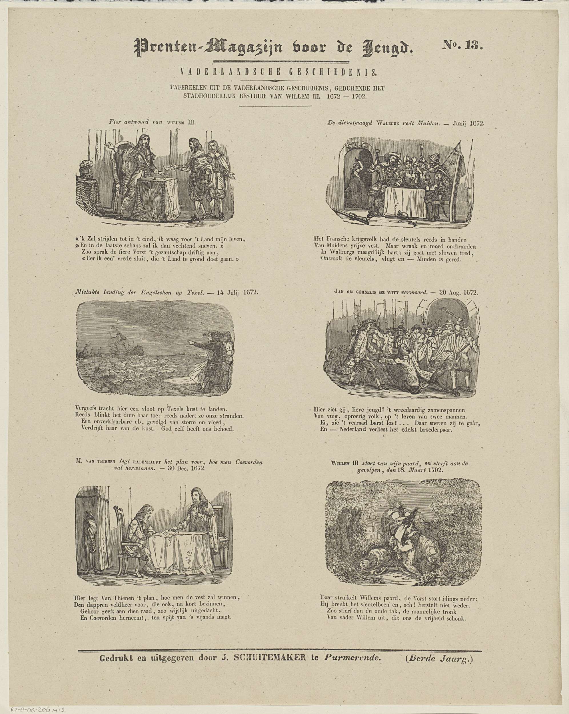 Blad met 6 voorstellingen over het leven van Willem III, tijdens zijn periode als stadhouder tussen 1672 en 1702. Boven elke voorstelling een titel en onder elke voorstelling een vierregelig vers. Genummerd rechtsboven: No. 13.