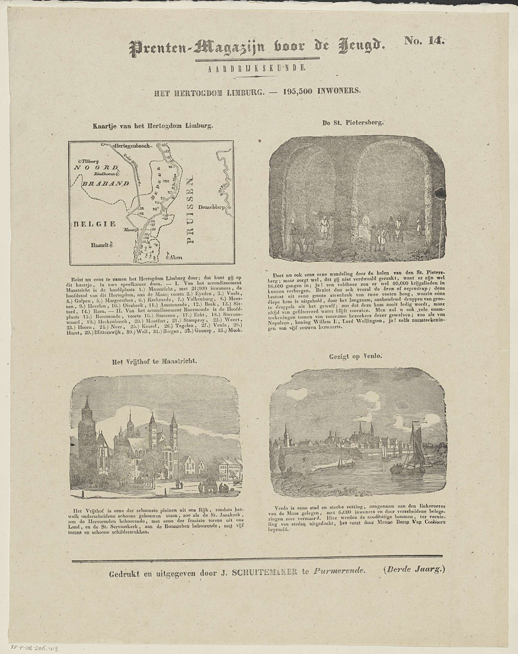 Blad met 4 voorstellingen over het hertogdom Limburg met een kaart en belangrijke plaatsen en gebouwen: de Sint-Pietersberg, het Vrijthof in Maastricht en Venlo. Boven elke voorstelling een titel en onder elke voorstelling een onderschrift. Genummerd rechtsboven: No. 14.