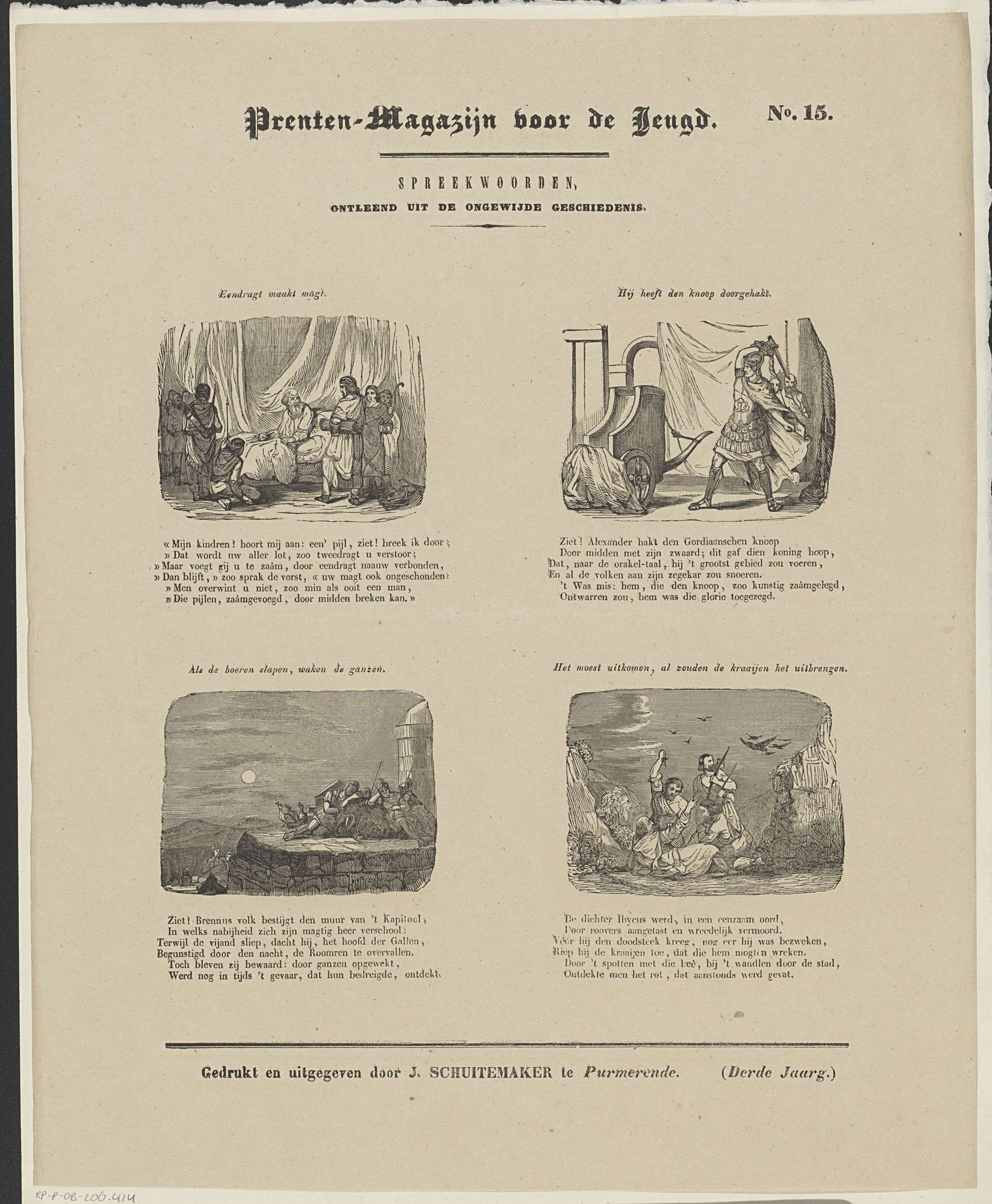Blad met 4 verbeeldingen van spreekwoorden, gebaseerd op historische verhalen. Boven elke voorstelling een titel en onder elke voorstelling een zesregelig vers. Genummerd rechtsboven: No. 15.