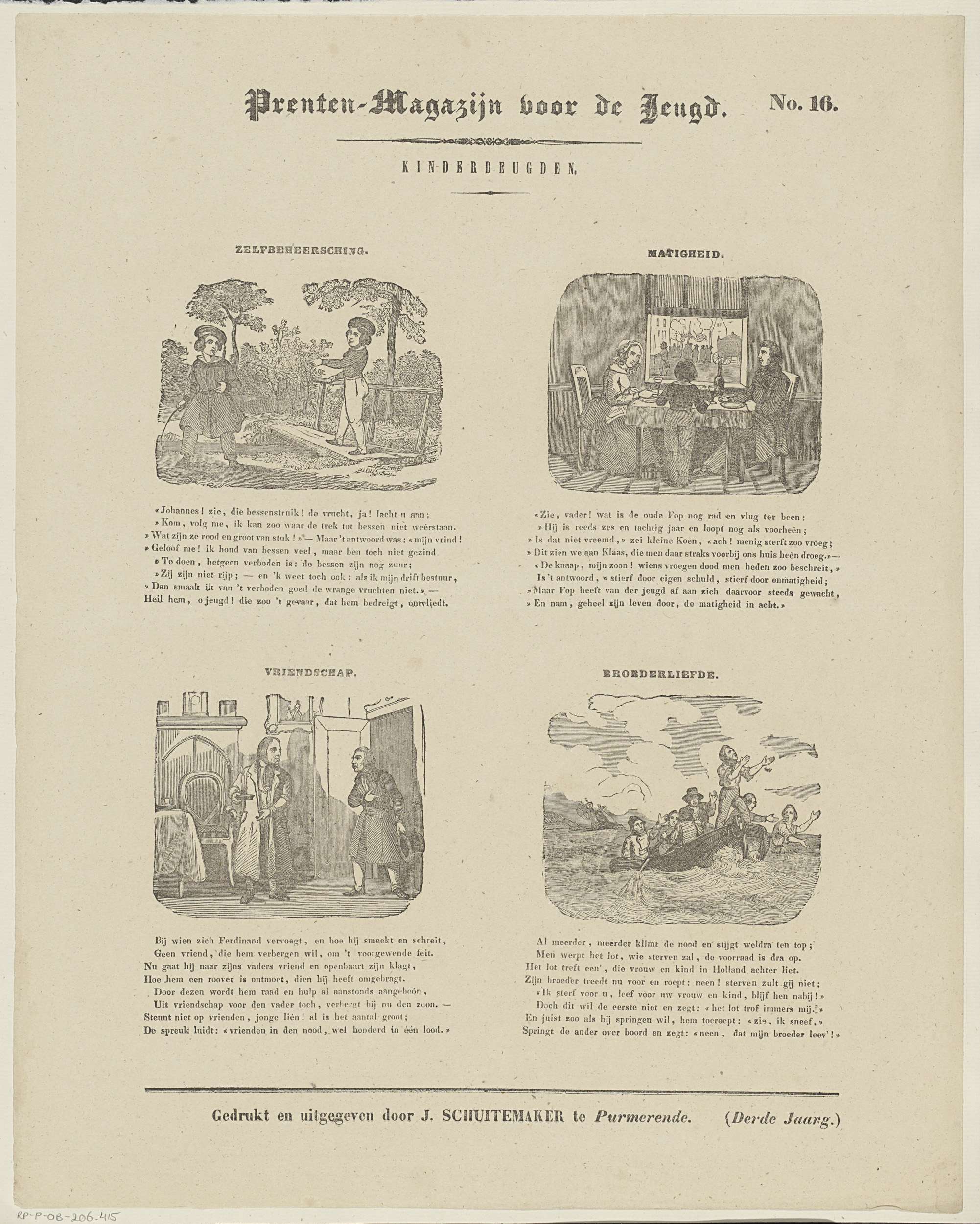Blad met 4 voorstellingen van kinderdeugden: zelfbeheersing, matigheid, vriendschap en broederliefde. Boven elke voorstelling een titel en onder elke voorstelling een achtregelig vers. Genummerd rechtsboven: No. 16.