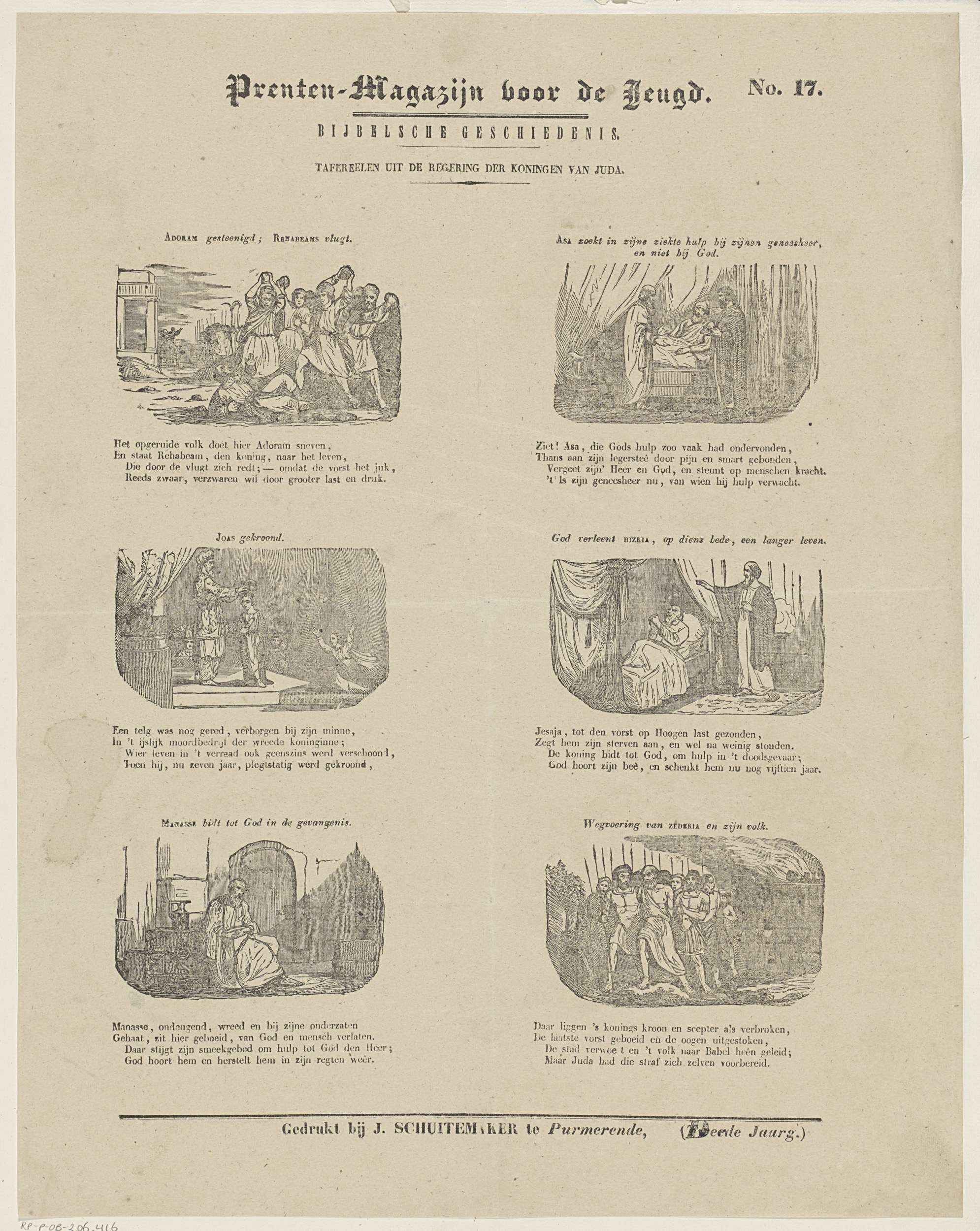 Blad met 6 voorstellingen over de regeringsperioden van de oudtestamentische koningen van Juda. Boven elke voorstelling een titel en onder elke voorstelling een vierregelig vers. Genummerd rechtsboven: No. 17.