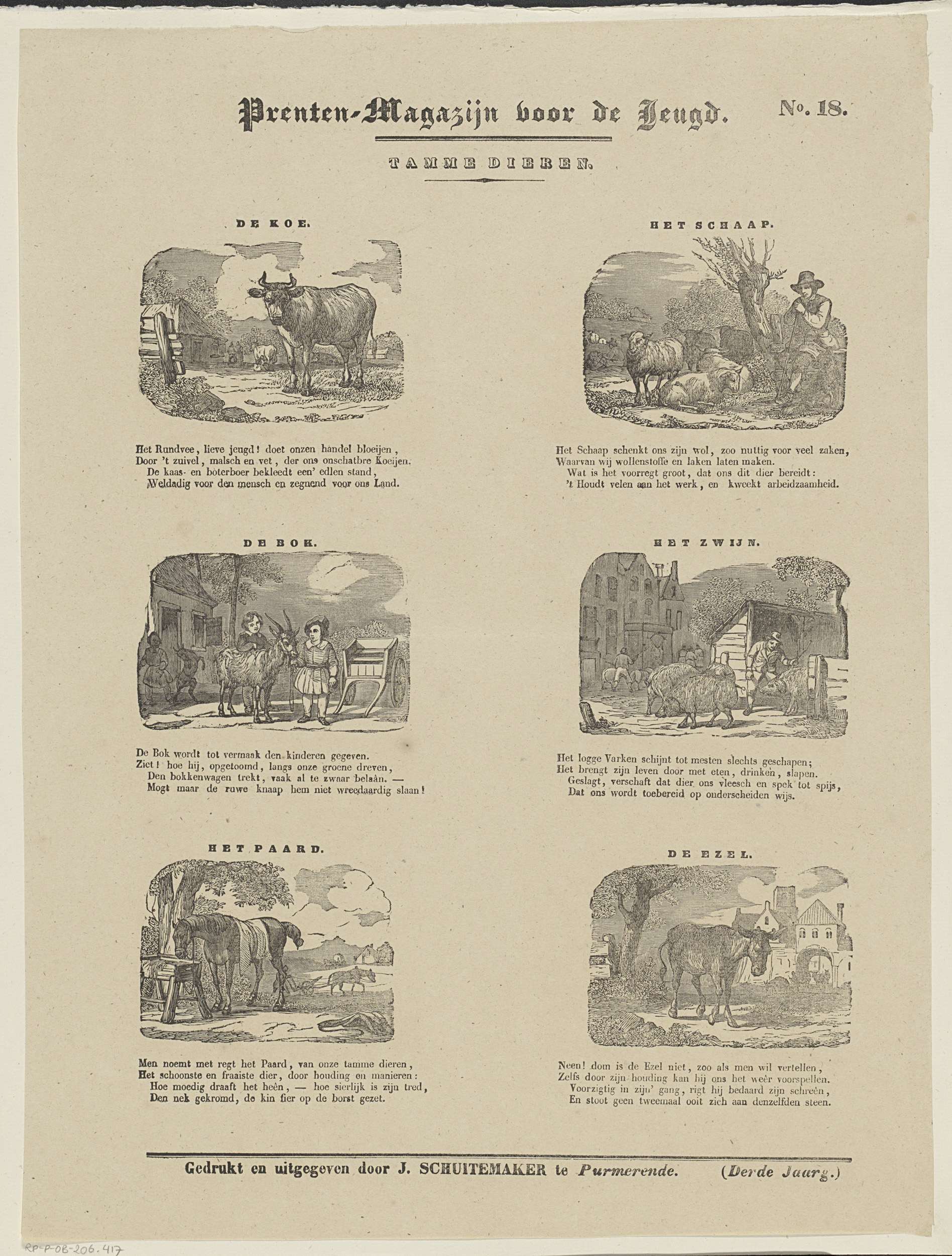 Blad met 6 voorstellingen van verschillende dieren: een koe, een schaap, een bok, een zwijn, een paard en een ezel. Boven elke voorstelling een titel en onder elke voorstelling een vierregelig vers. Genummerd rechtsboven: No. 18.