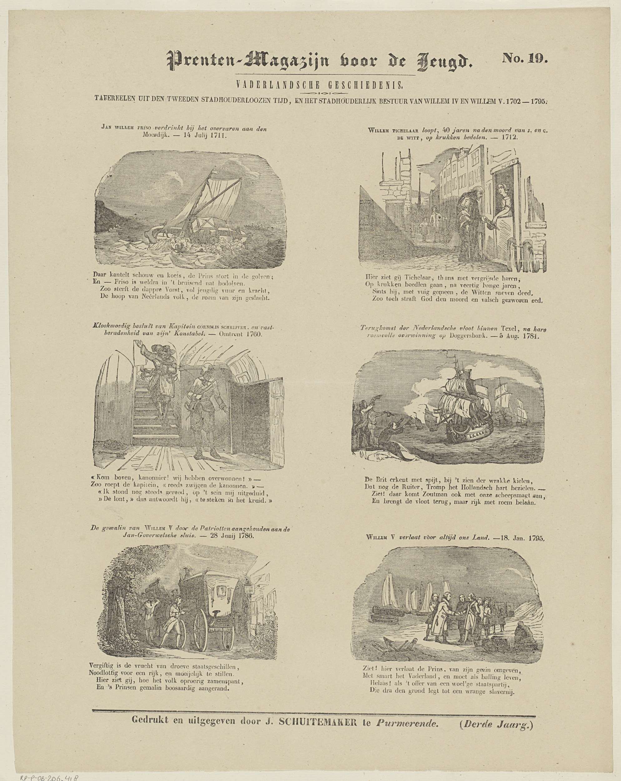 Blad met 6 voorstellingen van gebeurtenissen ten tijde van het Tweede Stadhouderloze Tijdperk tussen 1702 en 1795. Boven elke voorstelling een titel en onder elke voorstelling een vierregelig vers. Genummerd rechtsboven: No. 19.
