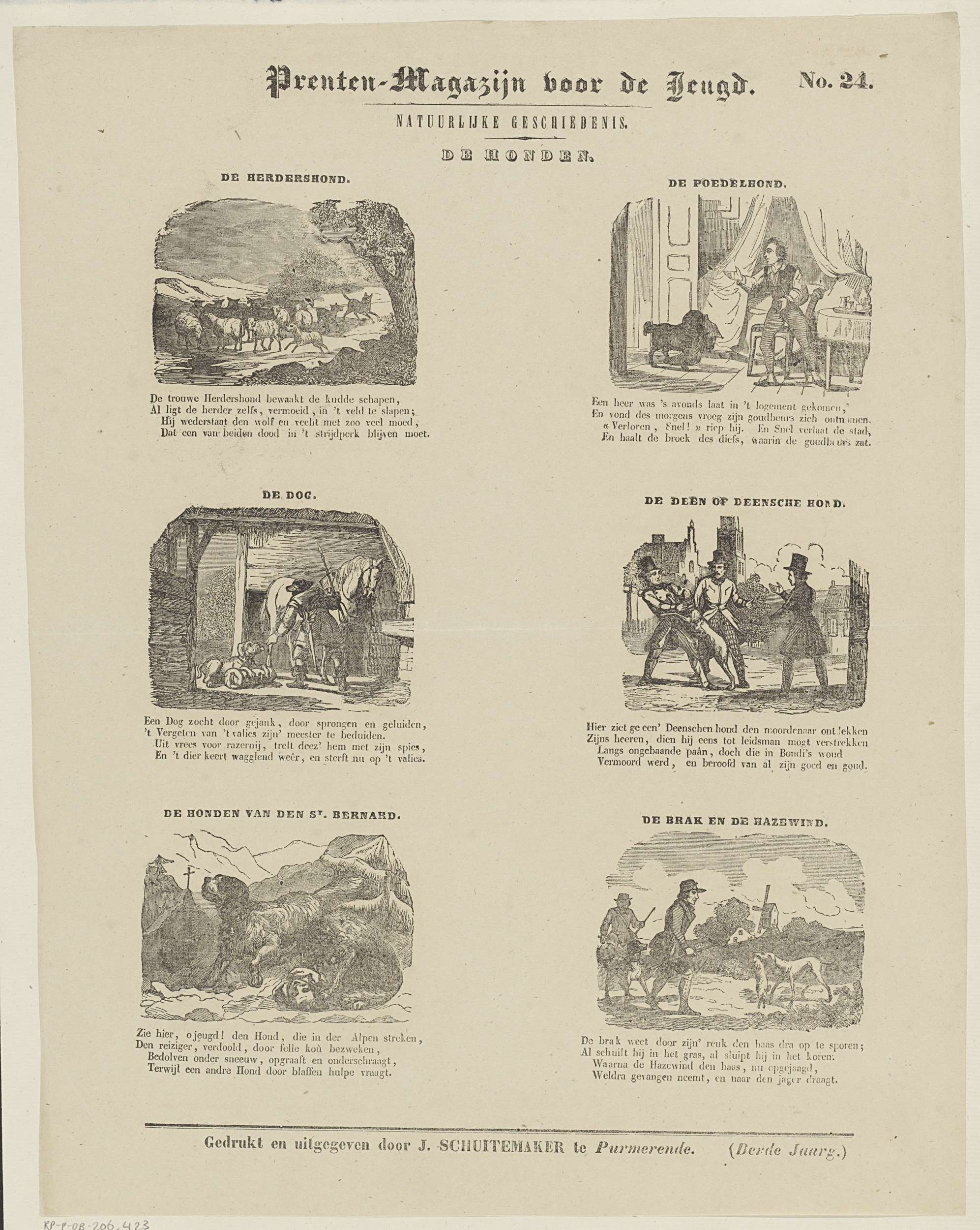 Blad met 6 voorstellingen van verschillende honden, zoals een herdershond, een poedel en een Sint-bernard. Boven elke voorstelling een titel en onder elke voorstelling een vierregelig vers. Genummerd rechtsboven: No. 24.