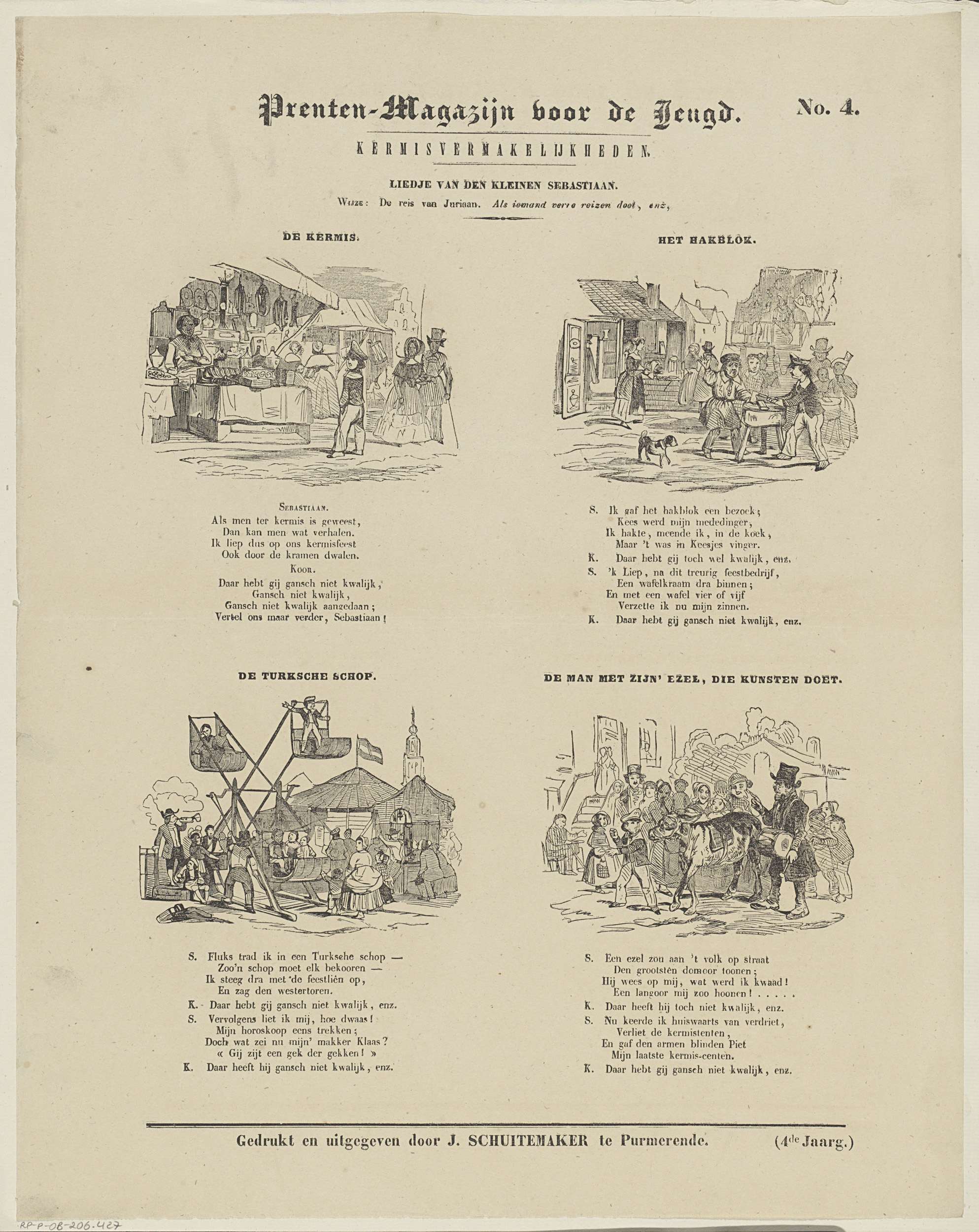 Blad met 4 kermistaferelen. Boven elke voorstelling een titel en onder elke voorstelling verzen uit het liedje van de kleine Sebastiaan. Genummerd rechtsboven: No. 4.