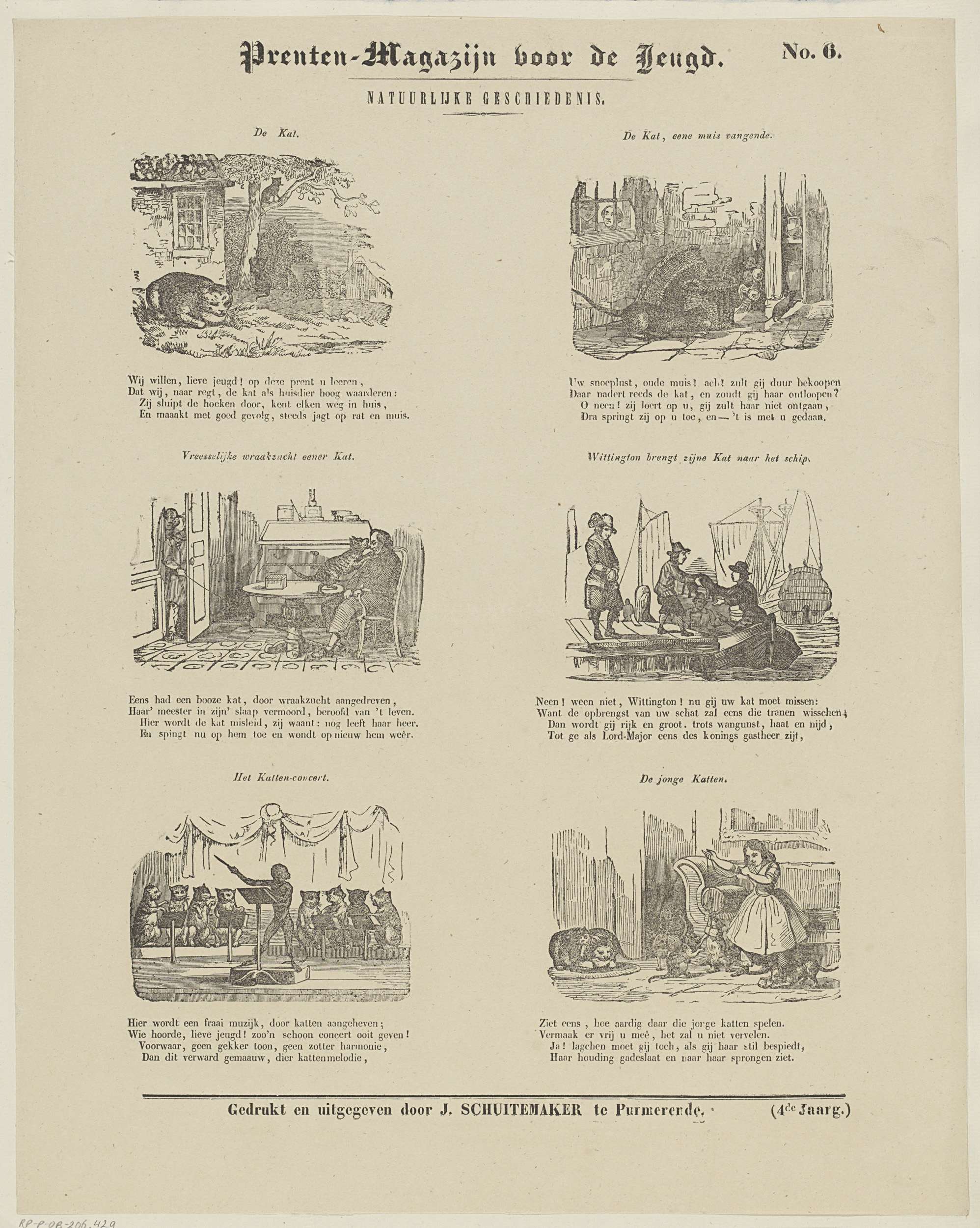 Blad met 6 voorstellingen van katten. Boven elke voorstelling een titel en onder elke voorstelling een vierregelig vers. Genummerd rechtsboven: No. 6.