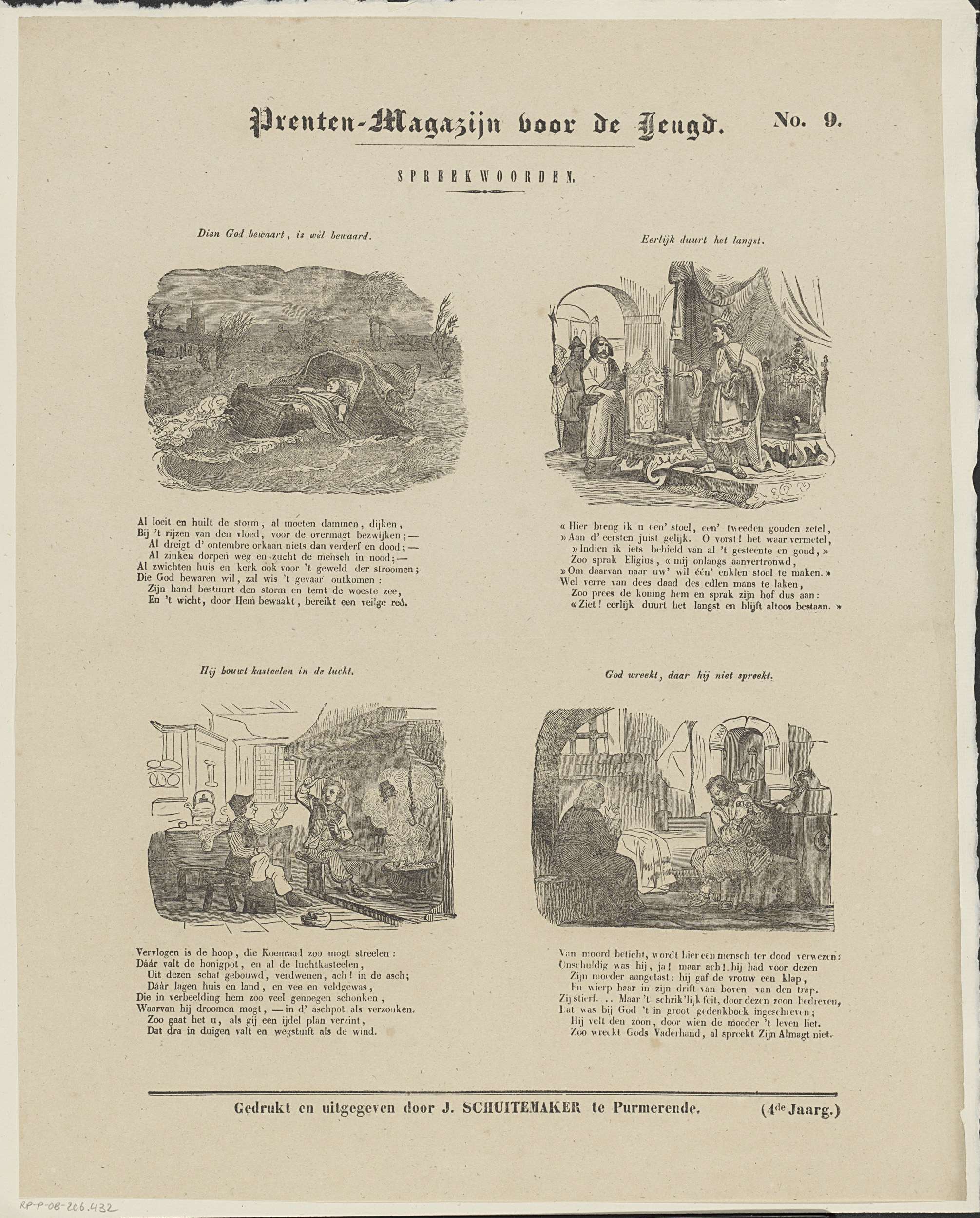 Blad met 4 verbeeldingen van spreekwoorden. Boven elke voorstelling een titel en onder elke voorstelling een achtregelig vers. Genummerd rechtsboven: No. 9.