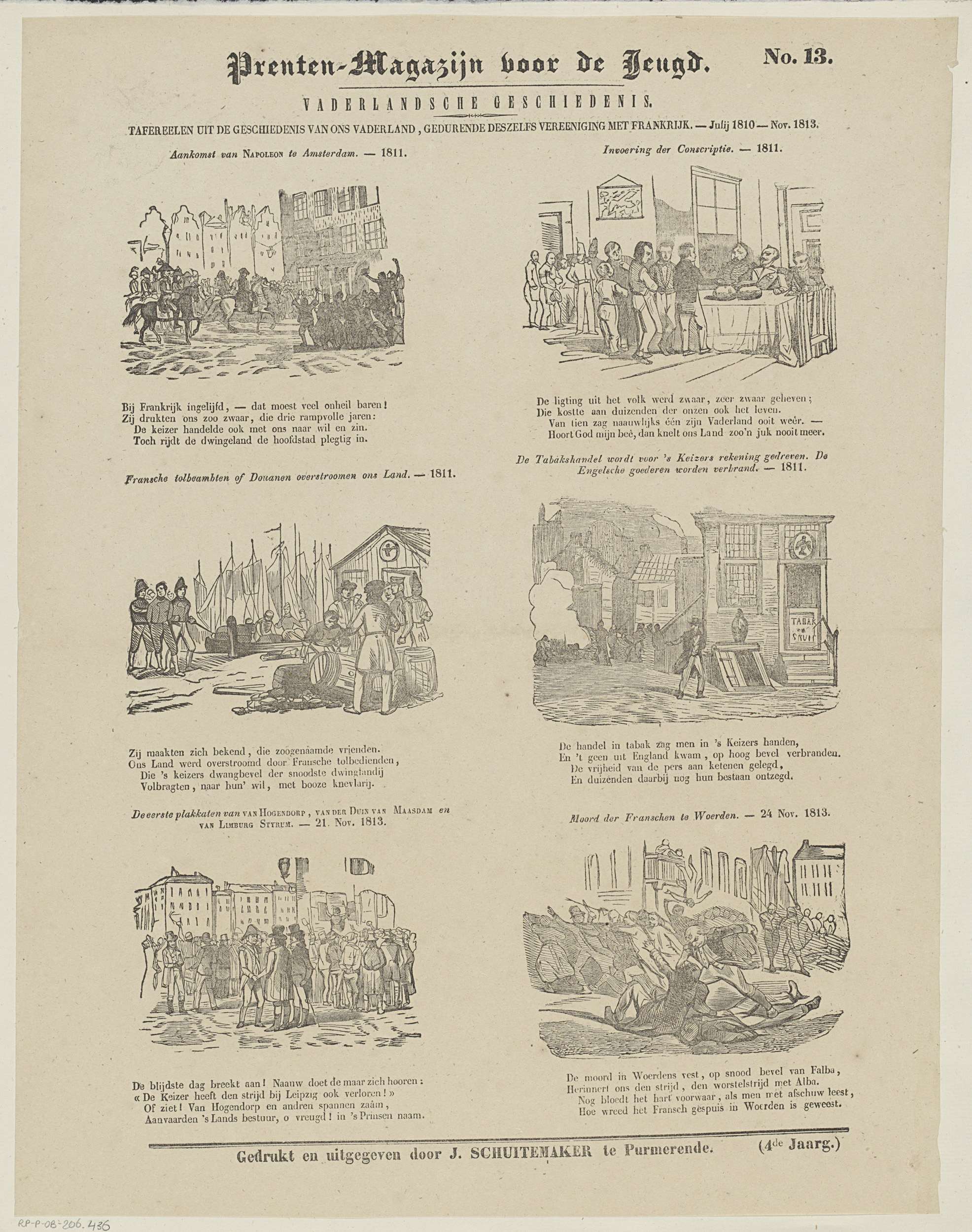 Blad met 6 voorstellingen van gebeurtenissen ten tijde van de Franse Tijd (1810-1813). Boven elke voorstelling een titel en onder elke voorstelling een vierregelig vers. Genummerd rechtsboven: No. 13.