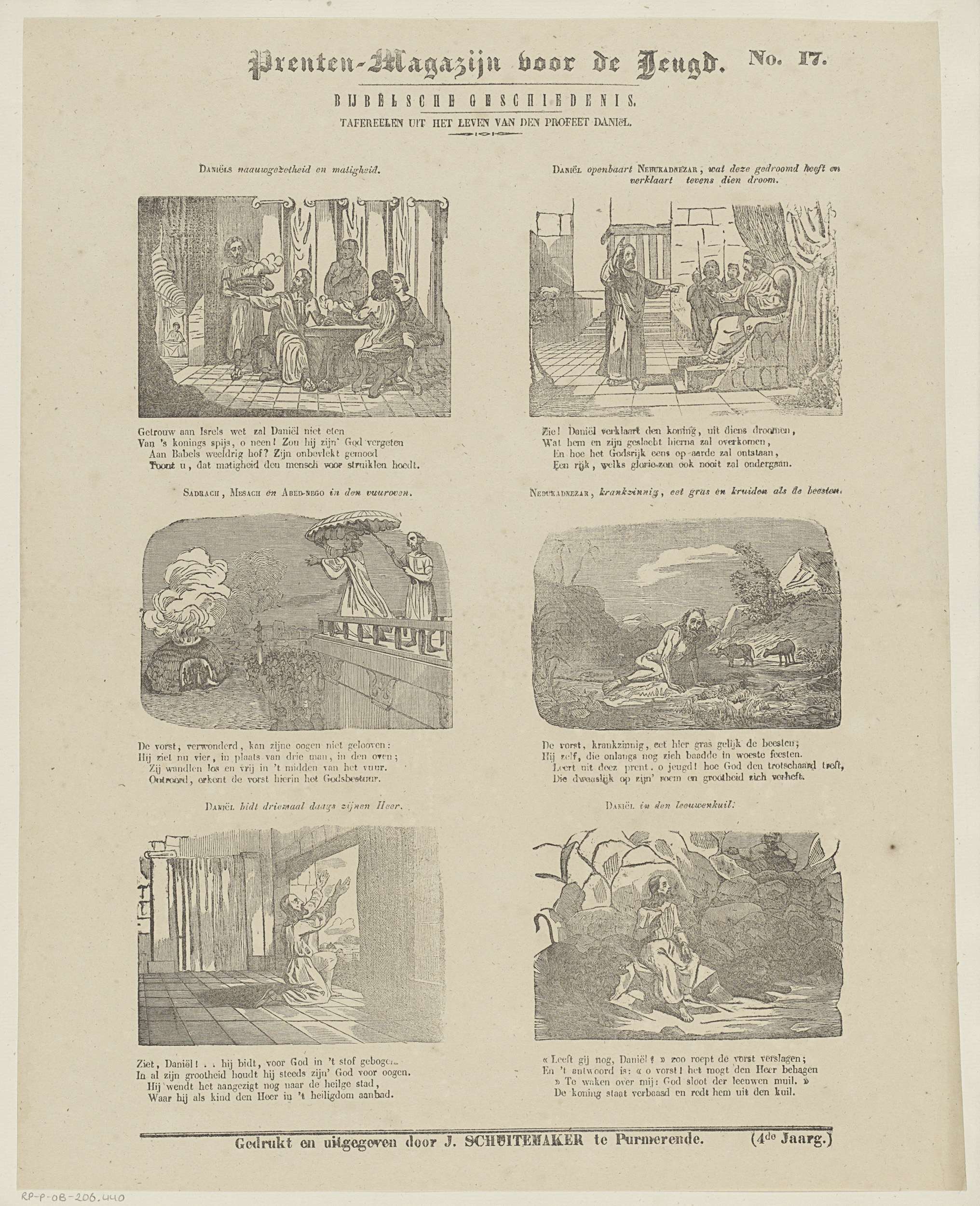 Blad met 6 voorstellingen uit het leven van de oudtestamentische profeet Daniël. Boven elke voorstelling een titel en onder elke voorstelling een vierregelig vers. Genummerd rechtsboven: No. 17.