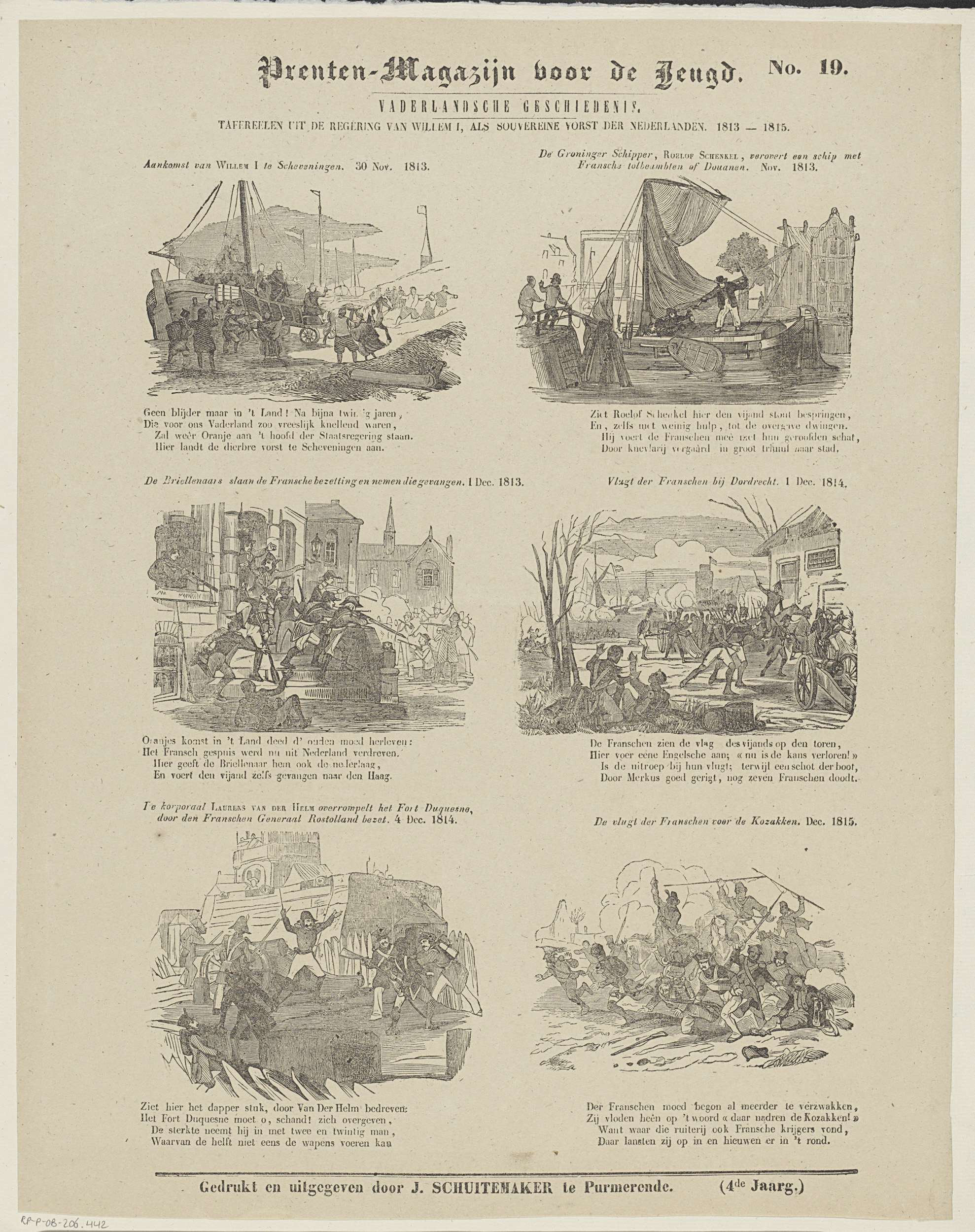 Blad met 6 voorstellingen van gebeurtenissen ten tijde van de regering van Willem I Frederik als Soeverein Vorst der Verenigde Nederlanden (1813-1815). Boven elke voorstelling een titel en onder elke voorstelling een vierregelig vers. Genummerd rechtsboven: No. 19.