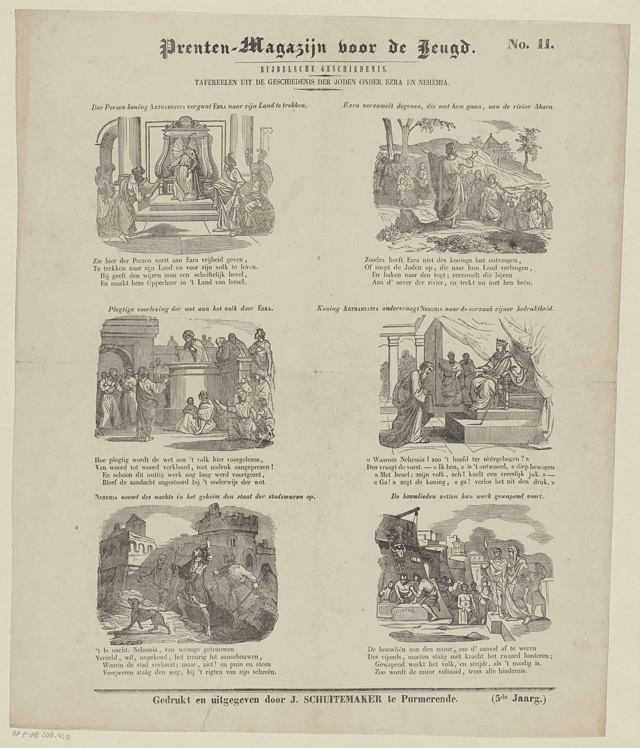 Blad met 6 voorstellingen van verhalen uit het Oude Testament. Boven elke afbeelding een titel, onder elke afbeelding een vierregelig vers. Genummerd rechtsboven: No. 11.