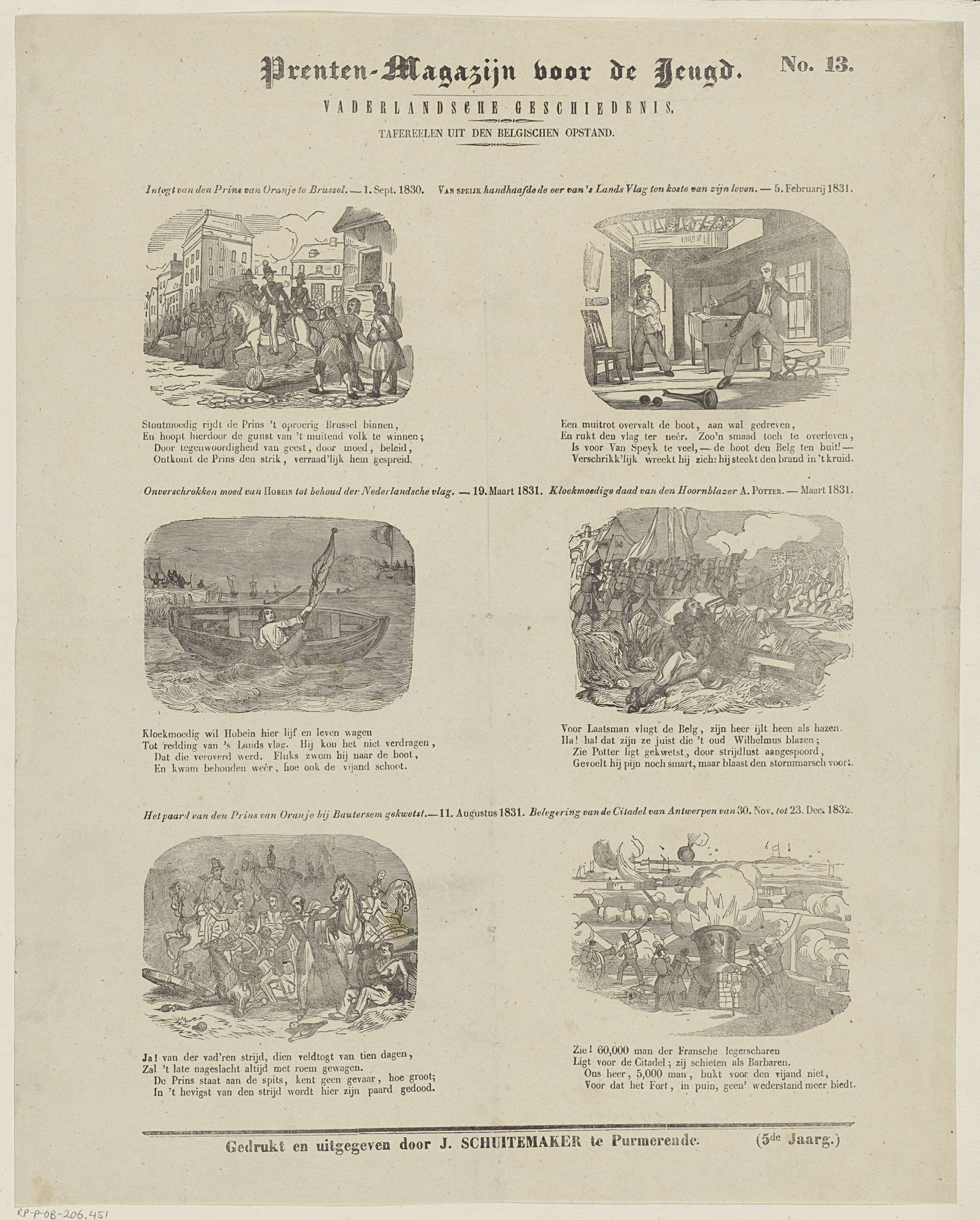 Blad met 6 voorstellingen van gebeurtenissen tijdens de Belgische Revolutie. Boven elke voorstelling een titel en onder elke voorstelling een vierregelig vers. Genummerd rechtsboven: No. 13.