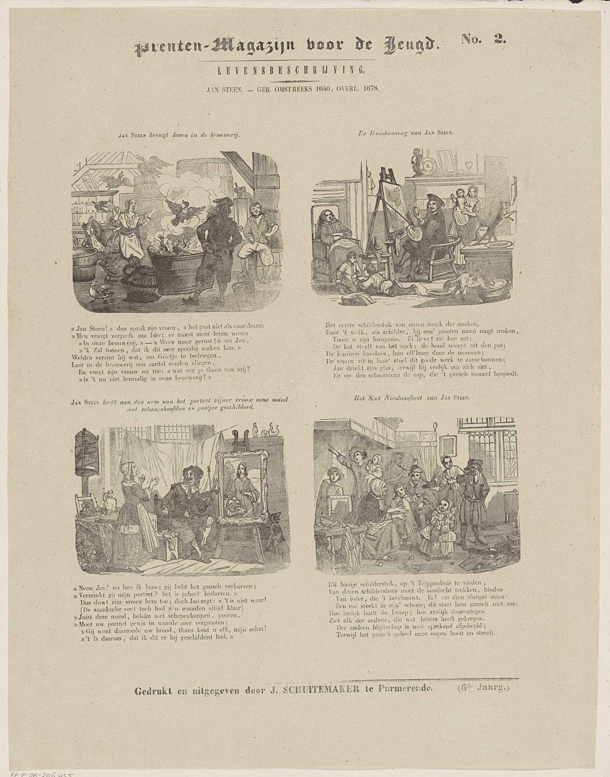 Blad met 4 voorstellingen uit het leven van Jan Havicksz. Steen. Boven elke afbeelding een titel, onder elke afbeelding een achtregelig vers. Genummerd rechtsboven: No. 2.