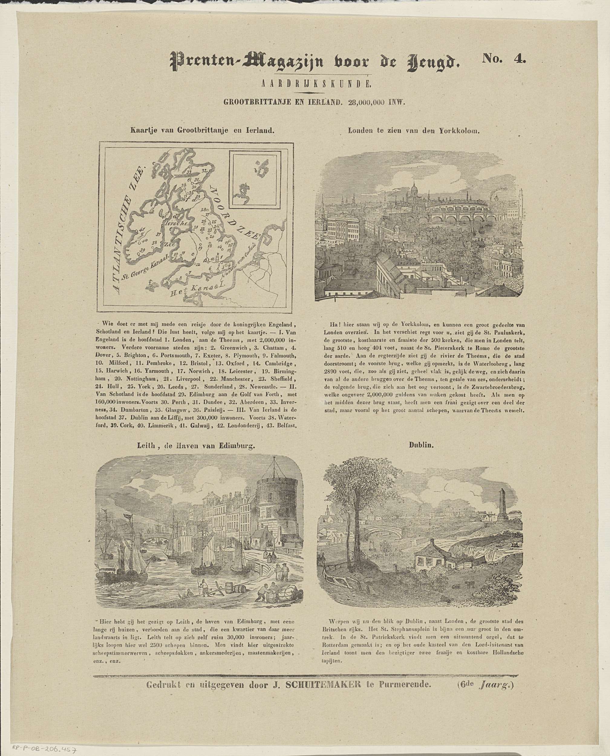 Blad met 4 voorstellingen over Groot-Brittannië en Ierland met een kaart en belangrijke steden: Londen, Edinburgh en Dublin. Boven elke voorstelling een titel en onder elke voorstelling een onderschrift. Genummerd rechtsboven: No. 4.