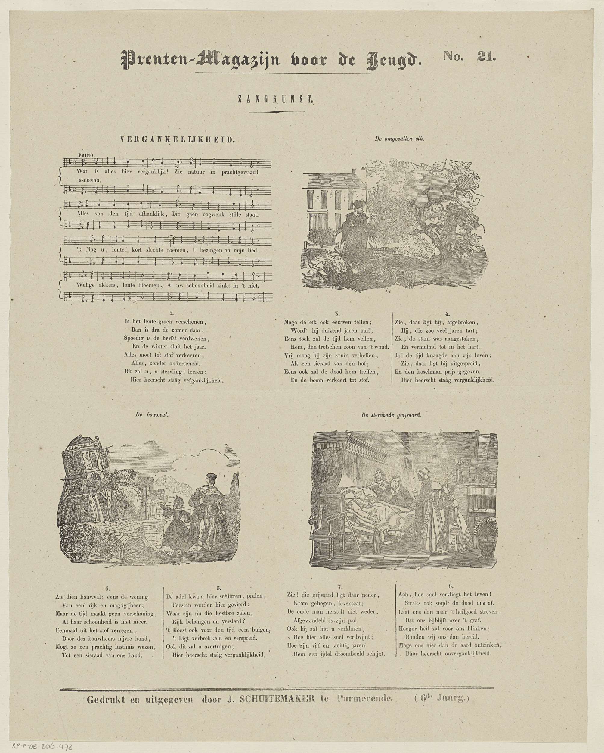 Blad met 3 voorstellingen en een stuk bladmuziek met een lied over vergankelijkheid. Boven elke voorstelling een titel en onder elke voorstelling coupletten van het lied. Genummerd rechtsboven: No. 21.