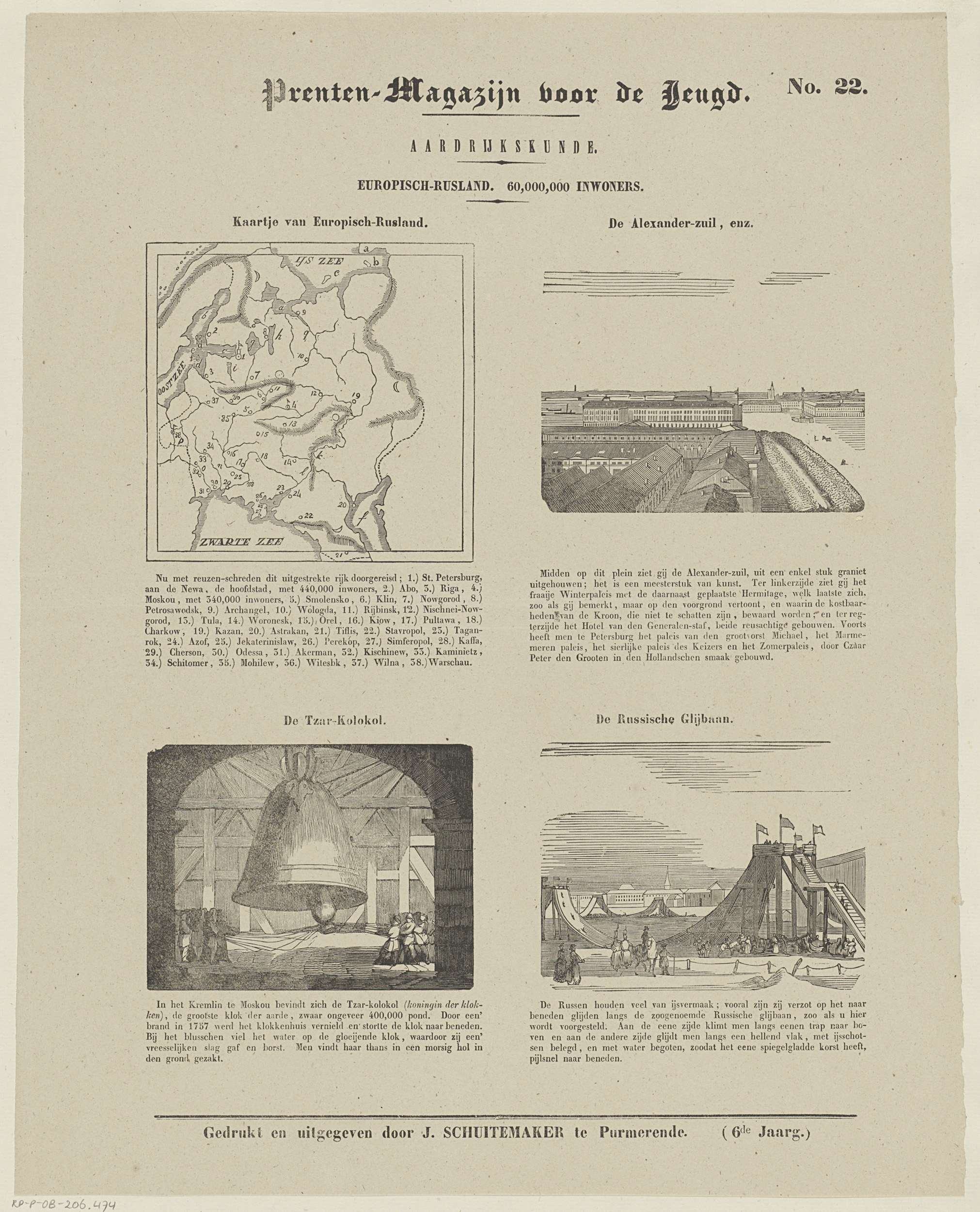 Blad met 4 voorstellingen over Europisch-Rusland met een kaart en belangrijke monumenten, zoals de Alexenderzuil en de Tsarenklok. Boven elke voorstelling een titel en onder elke voorstelling een onderschrift. Genummerd rechtsboven: No. 22.