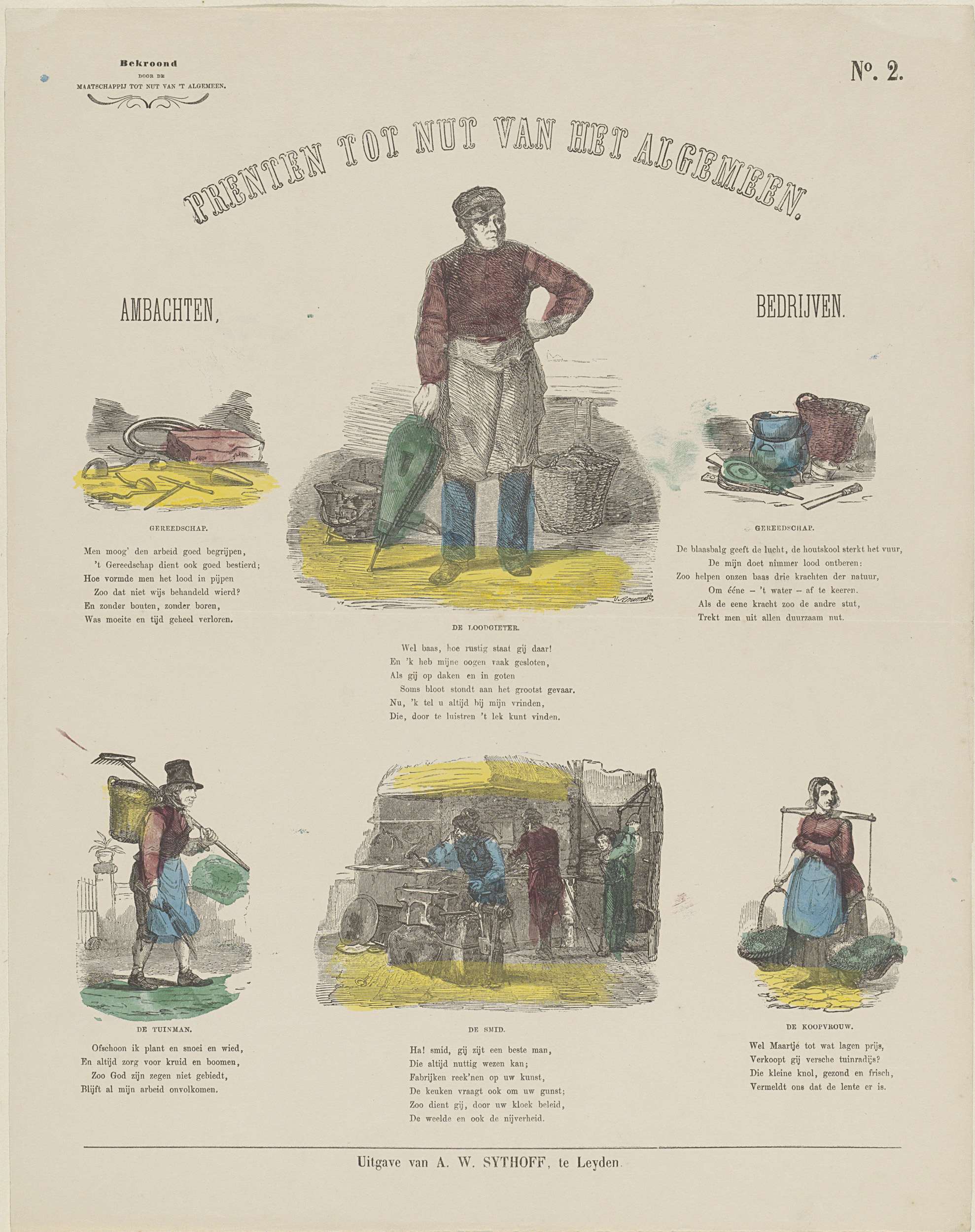 Blad met 6 voorstellingen van gereedschap, een loodgieter, een tuinman, een smid en een koopvrouw. Onder elke voorstelling een titel en een vers. Genummerd rechtsboven: No. 2. Linksboven: Bekroond door de Maatschappij tot Nut van 't Algemeen.