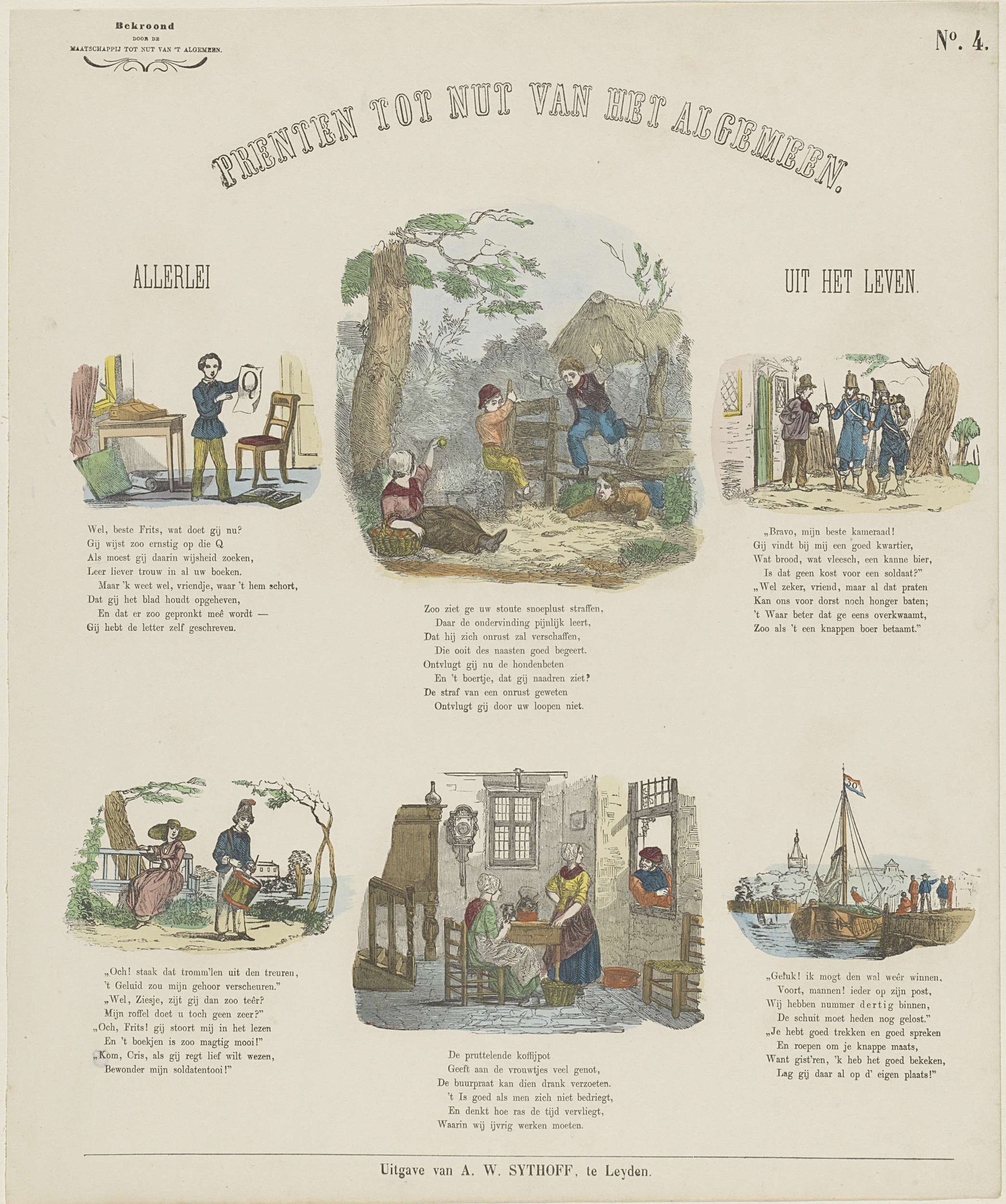 Blad met 6 voorstellingen van spelende kinderen, soldaten, een jongen met een trommel, twee vrouwen aan een keukentafel en een schip. Onder elke voorstelling een vers. Genummerd rechtsboven: No. 4. Linksboven: Bekroond door de Maatschappij tot Nut van 't Algemeen.